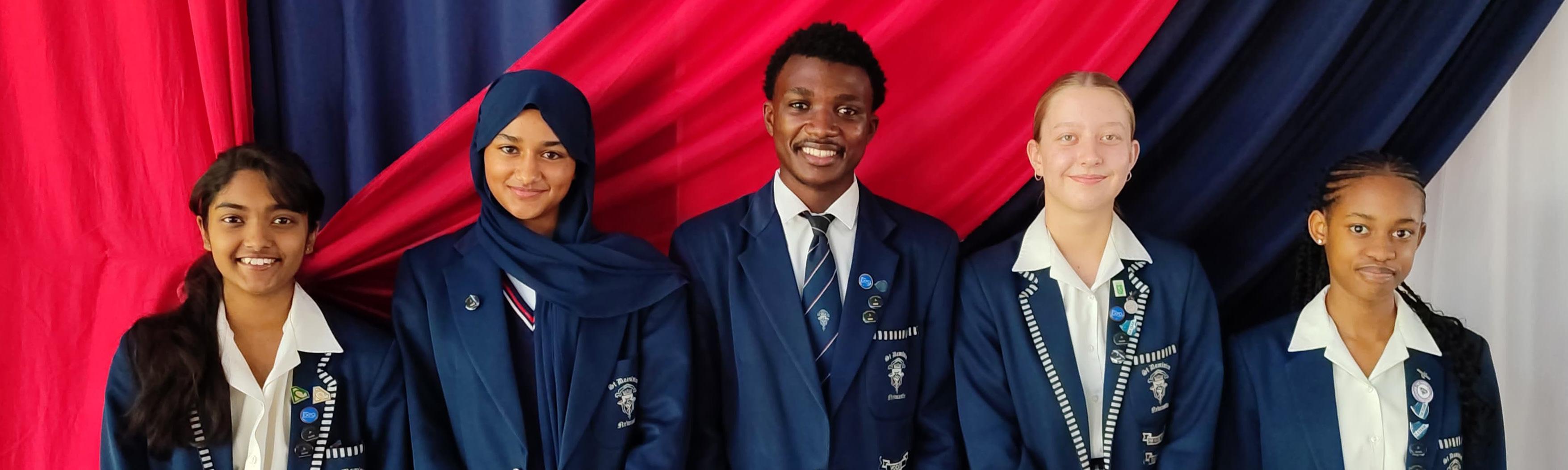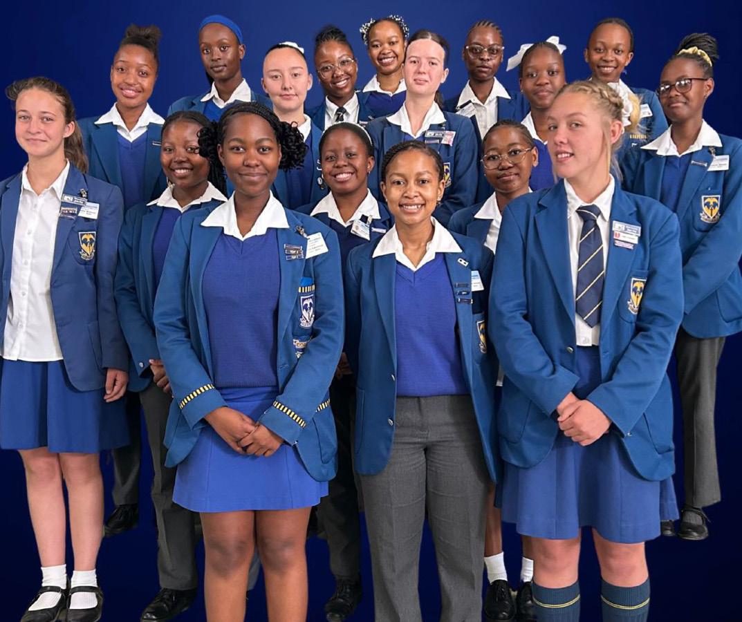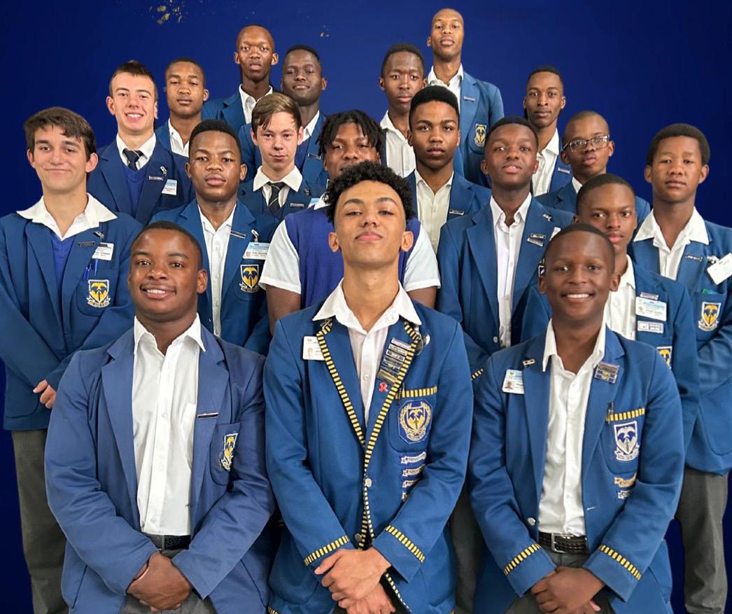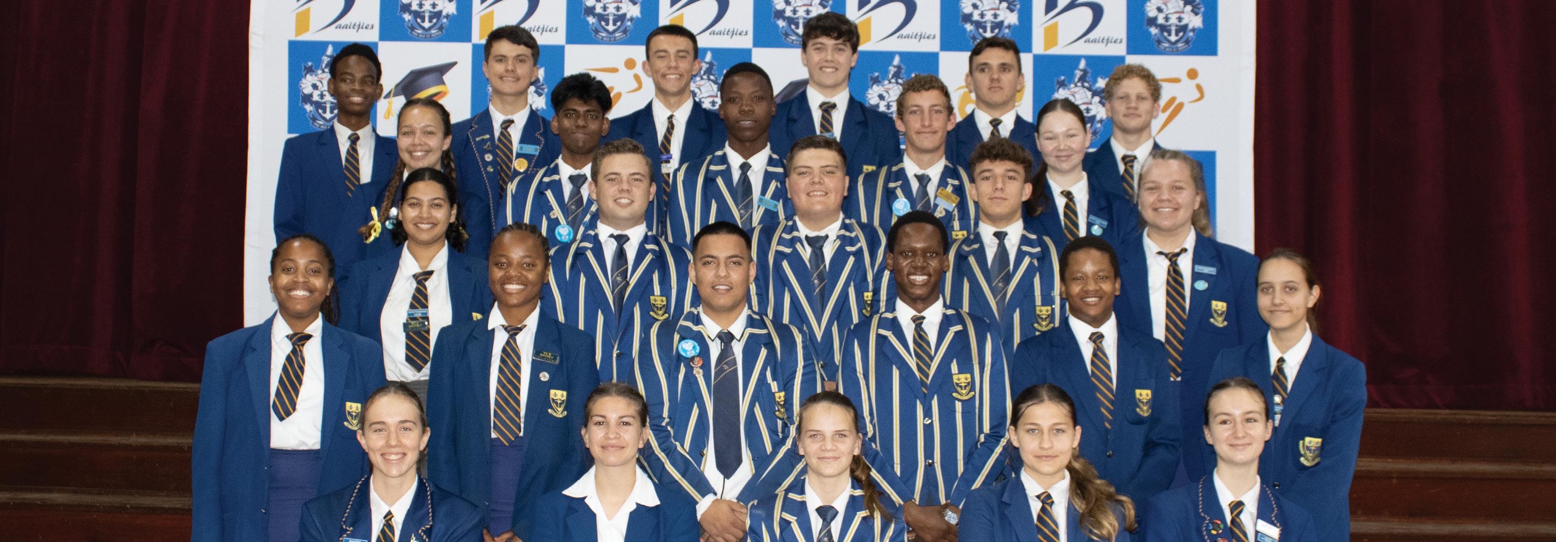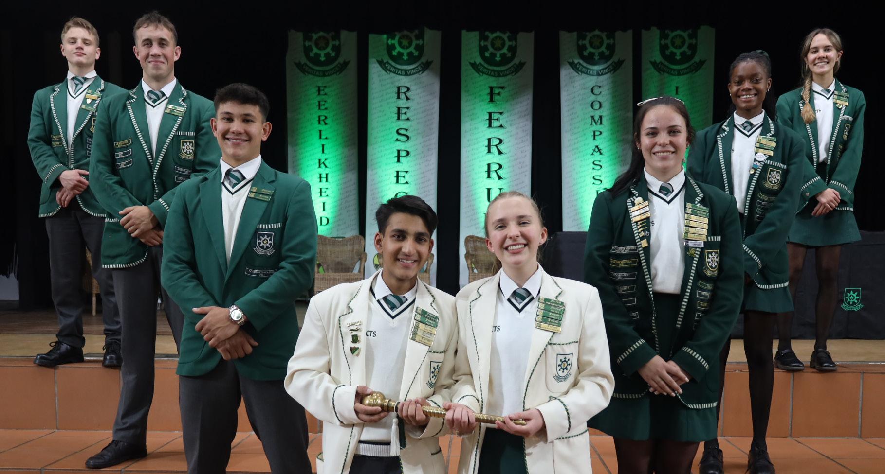 S’rikar Mohunram (Head Boy), Scarlett Uys (Head Girl), Pieter Campher (Onderhoofseun-Sport), Marike Rothmann (OnderhoofdogterSport), Zander Struwig (Onderhoofseun-Kultuur), Mary Omole (Deputy Head Girl-Culture), Frans Botha (Onderhoofseun-Akademies) en Ruby Beukes (Deputy Head Girl-Academics).