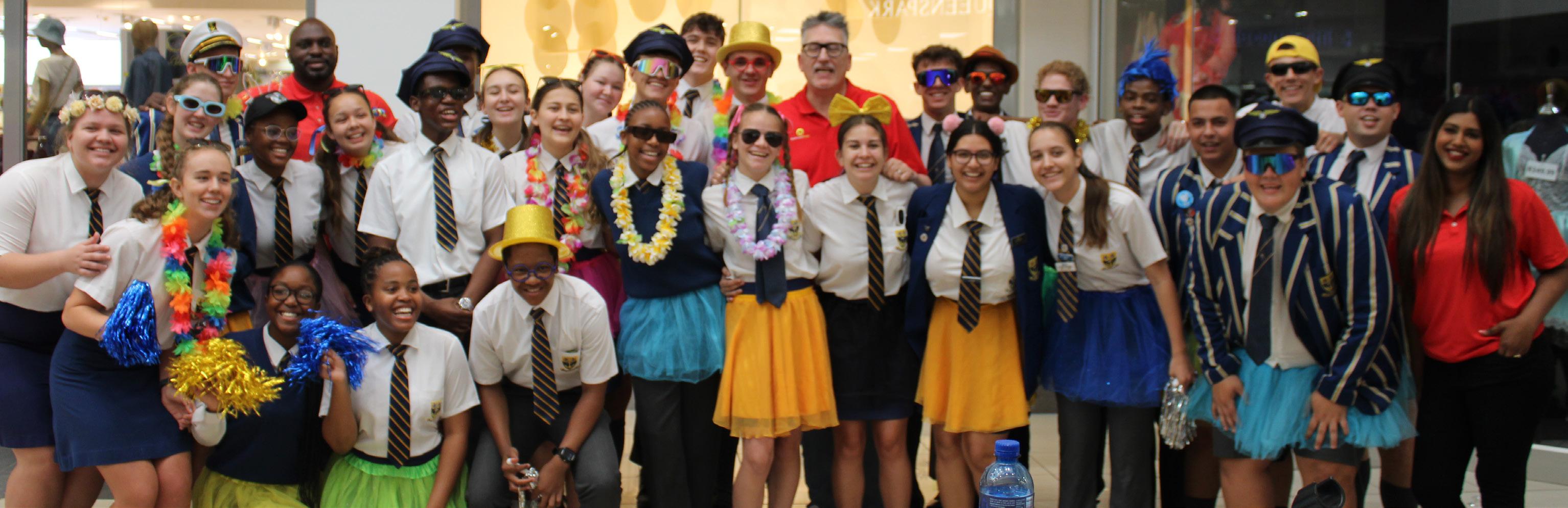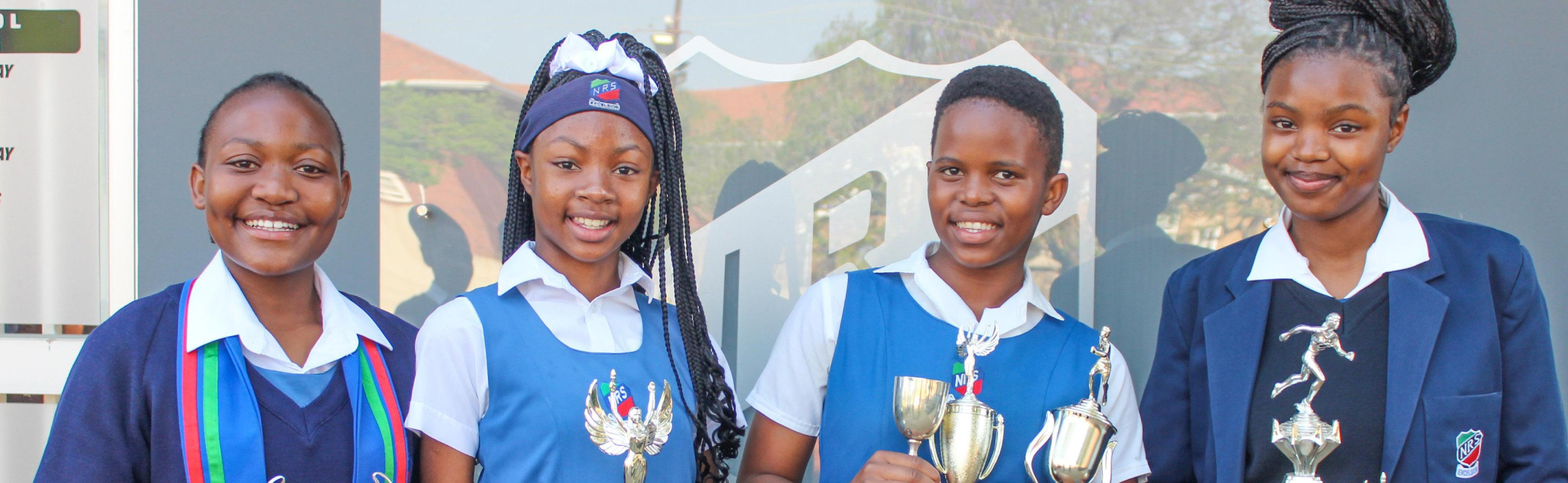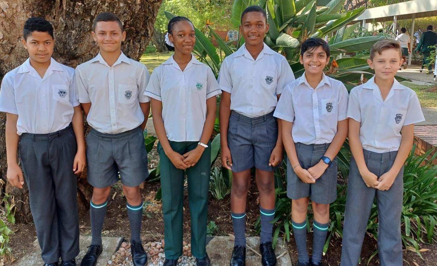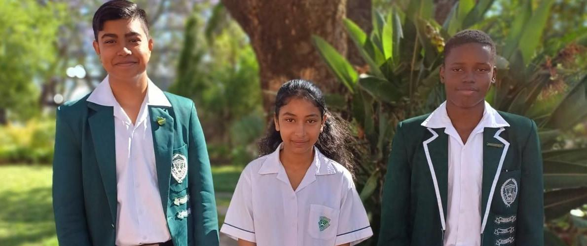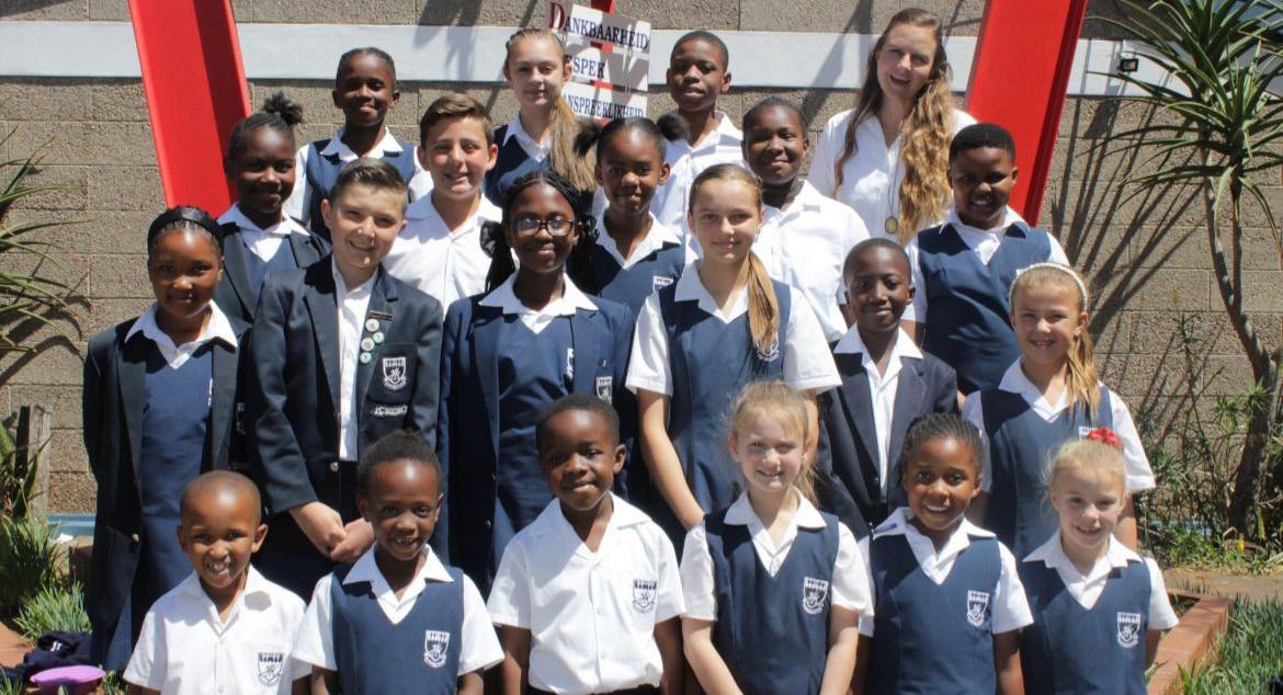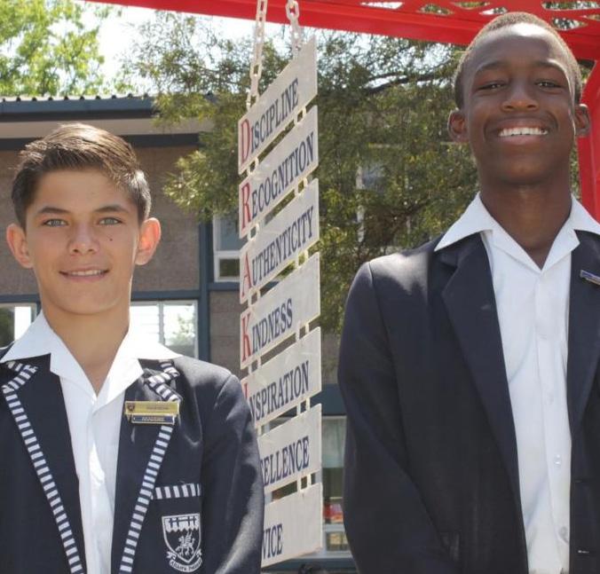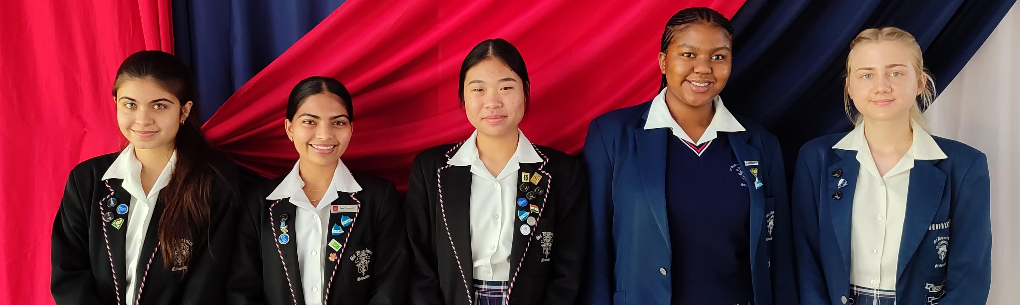 S’rikar Mohunram (Head Boy), Scarlett Uys (Head Girl), Pieter Campher (Onderhoofseun-Sport), Marike Rothmann (OnderhoofdogterSport), Zander Struwig (Onderhoofseun-Kultuur), Mary Omole (Deputy Head Girl-Culture), Frans Botha (Onderhoofseun-Akademies) en Ruby Beukes (Deputy Head Girl-Academics).