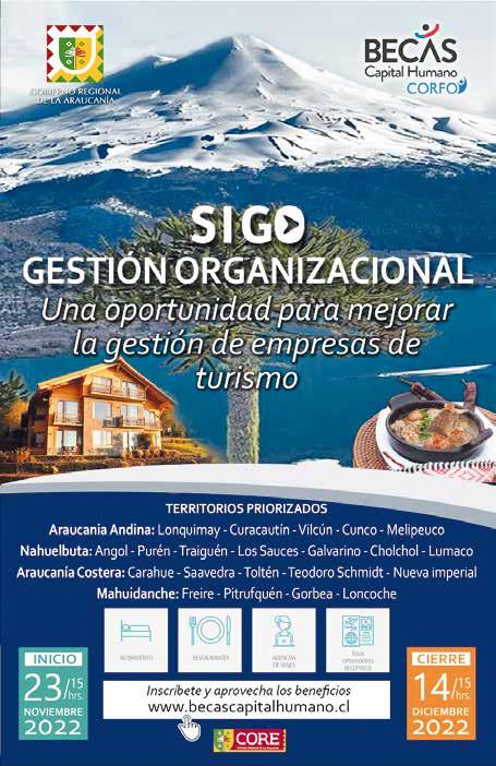 Luciano Rivas, Gobernador Regional señaló que son 60 becas con 100% de gratuidad, las que están disponibles para 60 personas, que formen parte de una empresa del sector turismo de la Región de La Araucania. “Estamos trabajando muy fuertemente en el sector turismo, implementando y ejecutando acciones orientadas a fortalecer capacidades y Capital Humano. Invitamos a los interesados a postular a la beca SIGO que es una Herramientas de apoyo empresarial, una iniciativa que busca mejorar la competitividad de la industria turística a través de herramientas de capacitación y asistencia técnica”.