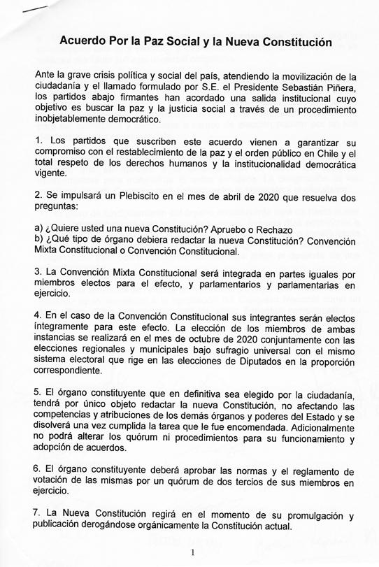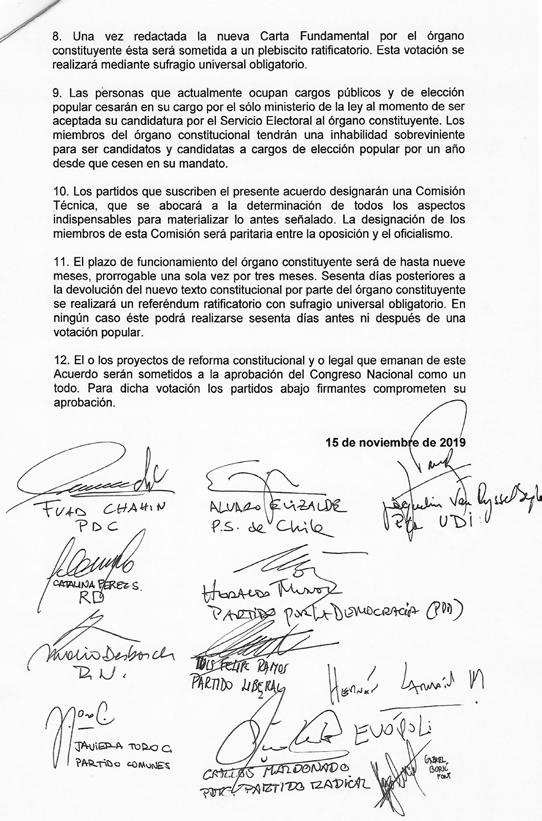Uno de los puntos que trabó por momentos la discusión del acuerdo entre los parlamentarios fue el relacionado con los quórums para aprobar las nuevas normas constitucionales, quedando en 2/3 de sus miembros. Esto quiere decir que se necesitará un 66,6% de los votos de la convención para que una norma sea aprobada. Luego de una febril jornada de negociaciones, líderes políticos determinaron que el gobierno de Chile convocará en conjunto con el Congreso Nacional a un “Plebiscito de entrada” en abril de 2020, en el cual se realizarán dos consultas a la ciudadanía: ¿Quiere usted una nueva Constitución? y ¿Qué tipo de órgano debiera redactar la Nueva Constitución? Pág. 8 y 9