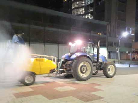de dos tractores con equipo nebulizador, los que están pasando por las calzadas y por las calles de la ciudad sanitizando con productos químicos. También hemos incorporado la sanitización de 500 paraderos de la locomoción colectiva, que es un trabajo que ya lo veníamos haciendo en forma nocturna y pretendemos seguir trabajando en aquello en los diferentes sectores de la ciudad, hemos continuado con el lavado de las aceras en el sector centro