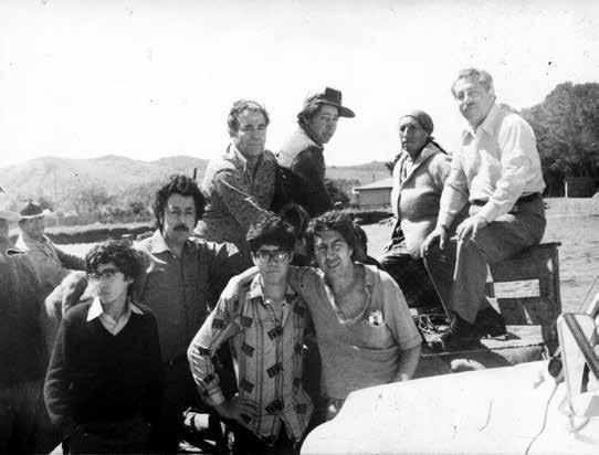 Imagen histórica de una jornada de “cacería artística” en la zona costera. Cruzando el lago Budi se observa a los pintores Héctor Robles Acuña, Humberto Aravena, Arsenio Herrera y Alfredo