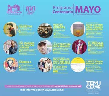En ese marco, es que durante mayo el emblemático espacio albergará una robusta programación cultural gratuita para toda la comunidad, entre las cuales destacan obras de teatro, de la mano de históricas compañías regionales como el Teatro-Pella y la Cía. TUM. Además, de la presentación de la obra “Gabriela” que recorre la vida de la nobel de literatura a través de la poesía, actuación y música en vivo. Para el público infantil, la biblioteca presentará todos los sábados actividades de fomento lector a través de cuenta cuentos y lecturas musicalizadas de diversas compañías regionales. A esto se suma, la música en vivo, que estará a cargo de la Orquesta Filarmónica de Temuco y el Coro del Teatro Municipal con presentaciones gratuitas en la sala de teatro de la Galo Sepúlveda. Los escritores Elicura Chihauilaf, Pedro Cayuqueo Ricardo Herrera y Sergio Gómez son parte de la programación literaria que presentará el espacio de la biblioteca con charlas, presentaciones de libros y un conversatorio denominado “Re-