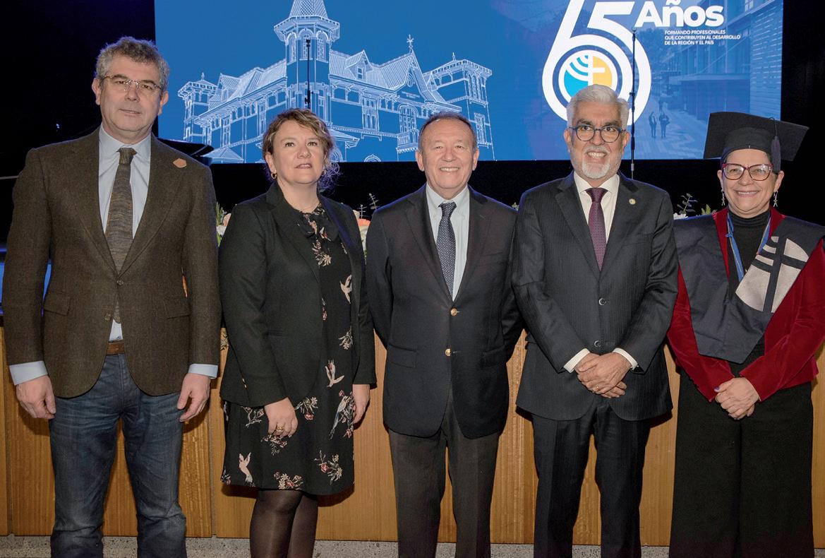reconocimiento a su larga trayectoria en la UCT. Salazar, quien ingresó a la universidad en 1978 y ha trabajado como conductor durante los últimos 26 años, expresó su agradecimiento a la comunidad universitaria, a su familia y a Dios, por haberle dado la salud y las oportunidades necesarias para realizar su trabajo durante 46 años. Emocionado, compartió su orgullo por ser parte de la UCT y por haber contribuido al desarrollo de la institución. Al finalizar la ceremonia, el rector Bórquez hizo un llamado a la comunidad universitaria a seguir trabajando con el mismo compromiso y dedicación para alcanzar los objetivos de la universidad. Agradeció el esfuerzo conjunto de todos los que han sido parte de este proyecto institucional, destacando que el cariño y la colaboración de la comunidad han sido fundamentales para el éxito alcanzado hasta ahora. Por su parte, las autoridades presentes en el evento también expresaron su reconocimiento al rector Bórquez y a la universidad. El senador José García Ruminot felicitó al rector por su gestión y señaló que la UCT tiene muchos motivos para celebrar, destacando el cariño y la admiración que la comunidad universitaria tiene por Bórquez. Manifestó su esperanza de que el rector continúe contribuyendo al éxito del sistema universitario, especialmente en el caso de la UCT. El secretario regional ministerial de Hacienda, Ronald Kliebs, también valoró la gestión del rector, destacando los 12 años que ha estado al frente de la universidad. Resaltó la colaboración entre la UCT y el Consejo Asesor Externo de Vinculación con el Medio, del cual forma parte, y señaló que el trabajo de la universidad es clave para enfrentar las necesidades del territorio. Kliebs subrayó que las universidades, y en particular la UCT, juegan un rol crucial en la búsqueda de soluciones y puntos de encuentro entre el mundo académico, el sector público y el privado. Finalmente, el acto de aniversario no solo celebró los 65 años de la Universidad Católica de Temuco, sino que también simbolizó el cierre de un ciclo de gestión bajo el liderazgo del rector Bórquez. El evento reflejó el compromiso de la UCT con la región, la educación inclusiva y el servicio a la comunidad, principios que seguirán guiando a la institución en el futuro.