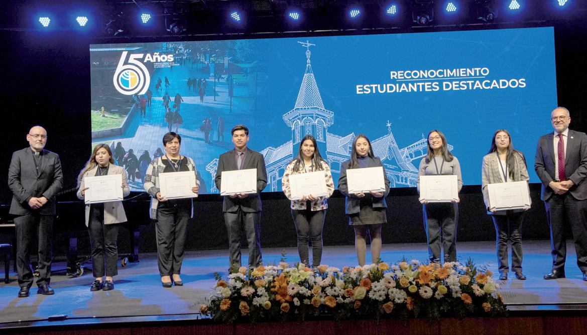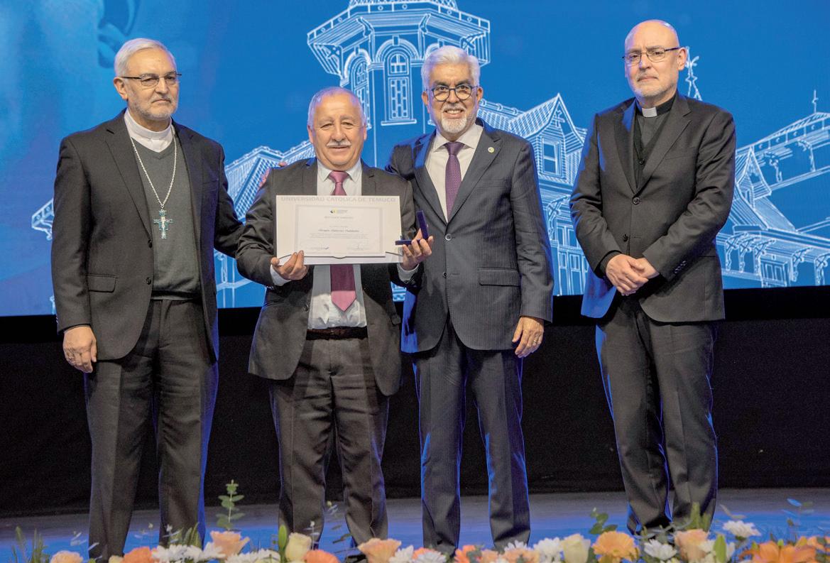 estudiantes de primer año provienen de contextos de alta vulnerabilidad, ingresando a través de programas de acceso inclusivo, lo que refleja el esfuerzo de la UCT por promover la equidad y dar oportunidades a quienes más lo necesitan. La ceremonia también incluyó un espacio para reconocer a miembros destacados de la comunidad universitaria. El Gran Canciller, Monseñor Concha, y el rector Bórquez entregaron la Medalla Monseñor Alejandro Menchaca Lira al funcionario Sergio Salazar, en