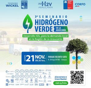 El próximo 21 de noviembre, a partir de las 8:00 AM, el recinto de SOFO en La Araucanía será sede del tercer Seminario Internacional de Hidrógeno Verde bajo el título "Desarrollo H2v para la demanda local en la región de La Araucanía". Este evento reunirá a expertos y actores de la industria para analizar el potencial del hidrógeno verde en la región y su papel en la transición energética. Entre los ponentes confirmados se encuentran el Dr. Emilio Nieto, director del Centro Nacional de Tecnologías del Hidrógeno de España; Ángela Castillo de Black & Veatch; Luis Castillo de la Agencia de Sostenibilidad Energética, y varios expertos nacionales. Para inscripciones, visitar https://bit. ly/h2v. Más información en las redes sociales de Instagram y LinkedIn: @mesa_ h2varaucania.