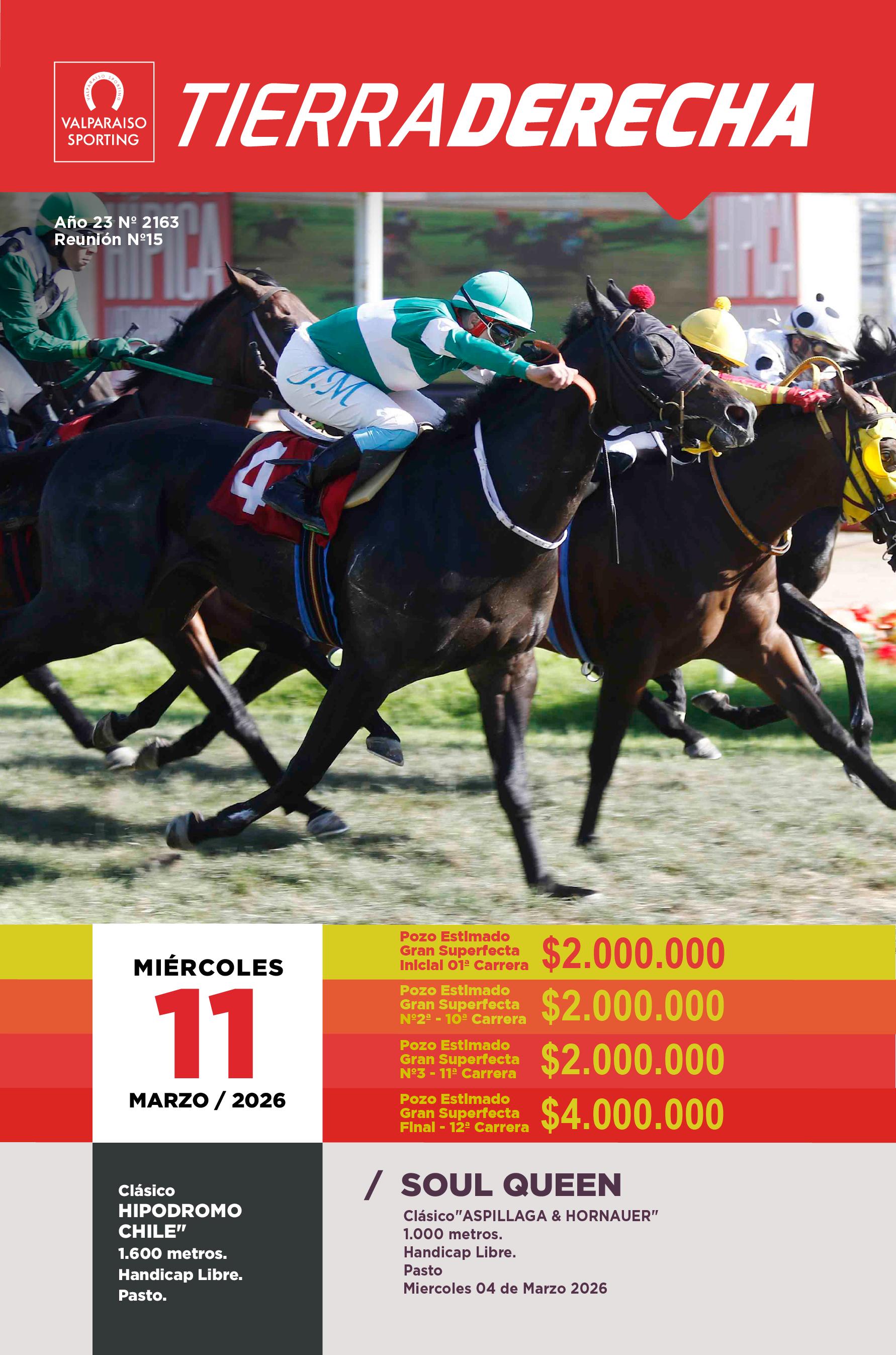 h.c International Star (usa) y JanaanMarcos Contrerasrojo, estrellas yGuerrero De La Vida por Dushyantor (H. Las Araucarias)V6brazaletes negro. 25feb264291100Vna7º*8 1/458Warrior Spirit1:08:35(16)59Guillermo A. Perez$616-97314 18feb264321200Vna4º455Tonada Vieja1:14:8659Guillermo A. Perez$33Clasi.6077 01feb264341100Vna7º*8 3/458El Gran Pirata1:08:13(14)57Jonathan Castillo$1516-123724 19ene264311100Vna4º*3 1/454Indian Melody1:08:32(15)55Joaquin Herrera$1020-13253217dic254291100Vna1º3/457Bettolina1:09:07(11)57Joaquin Herrera$6 12-1049253