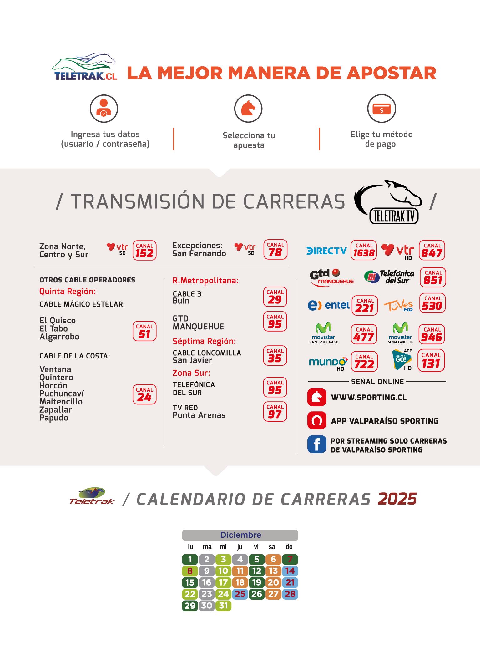 1.100 metros. Condicional. Serie B. Para Machos de 3 años perdedores y que no hayan figurado 2º y 3º en los últimos 15 días. No obstante, podrán inscribirse los que hayan figurado en los lugares 2º y 3º de esta Serie B. Peso 57 kilos. ARENA.