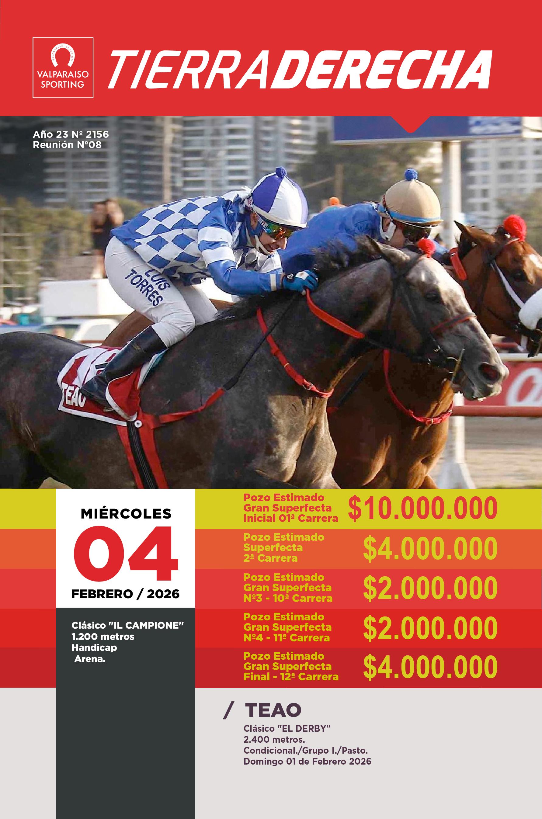 ELLOCO PEYUCO21/01/2026buscó hacia afuera en la curva 11/01/2026saltó hacia afuera al partir GUAPAPORTEÑA01/02/2026fue abierto (a) entre los 600 y los últimos 400 metros. 24/12/2025saltó hacia afuera al partir BOMBONETE31/12/2025saltó al partir