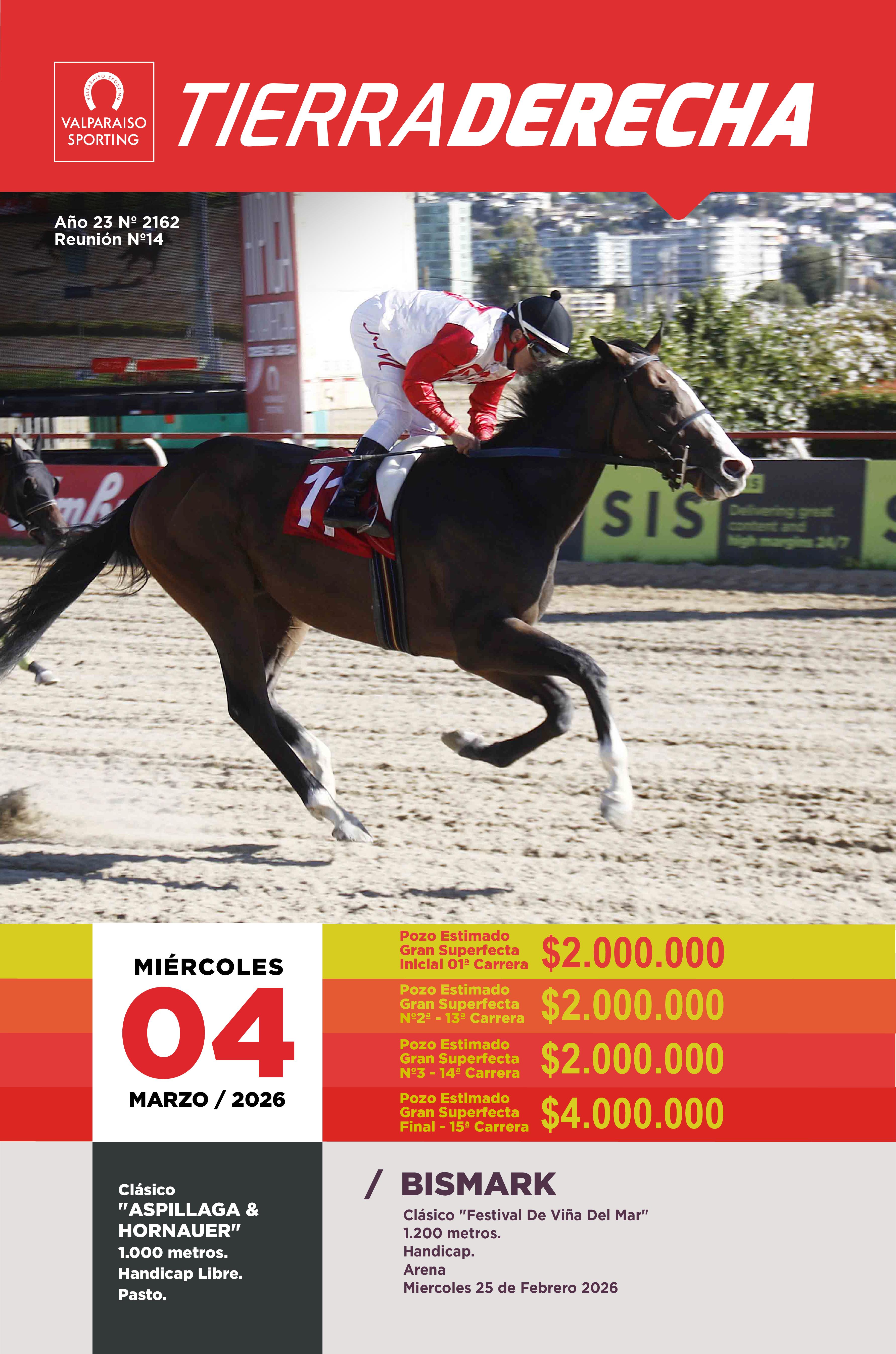 03/12/2025 encajonado(a) en los 900 metros ILVENTO25/02/2026 se presentó su preparador a manifestar su disconformidad con la carrera 16/02/2026partió levemente desmejorado(a) JERUSA01/02/2026cortada su línea de carrera en los 300 metros 01/02/2026 cargado(a) en los últimos 300 metros. 21/01/2026cargado al partir CHE SAMARITAN11/01/2026cargado (a) en los 700 metros 11/01/2026cortada su línea de carrera en los 700 metros