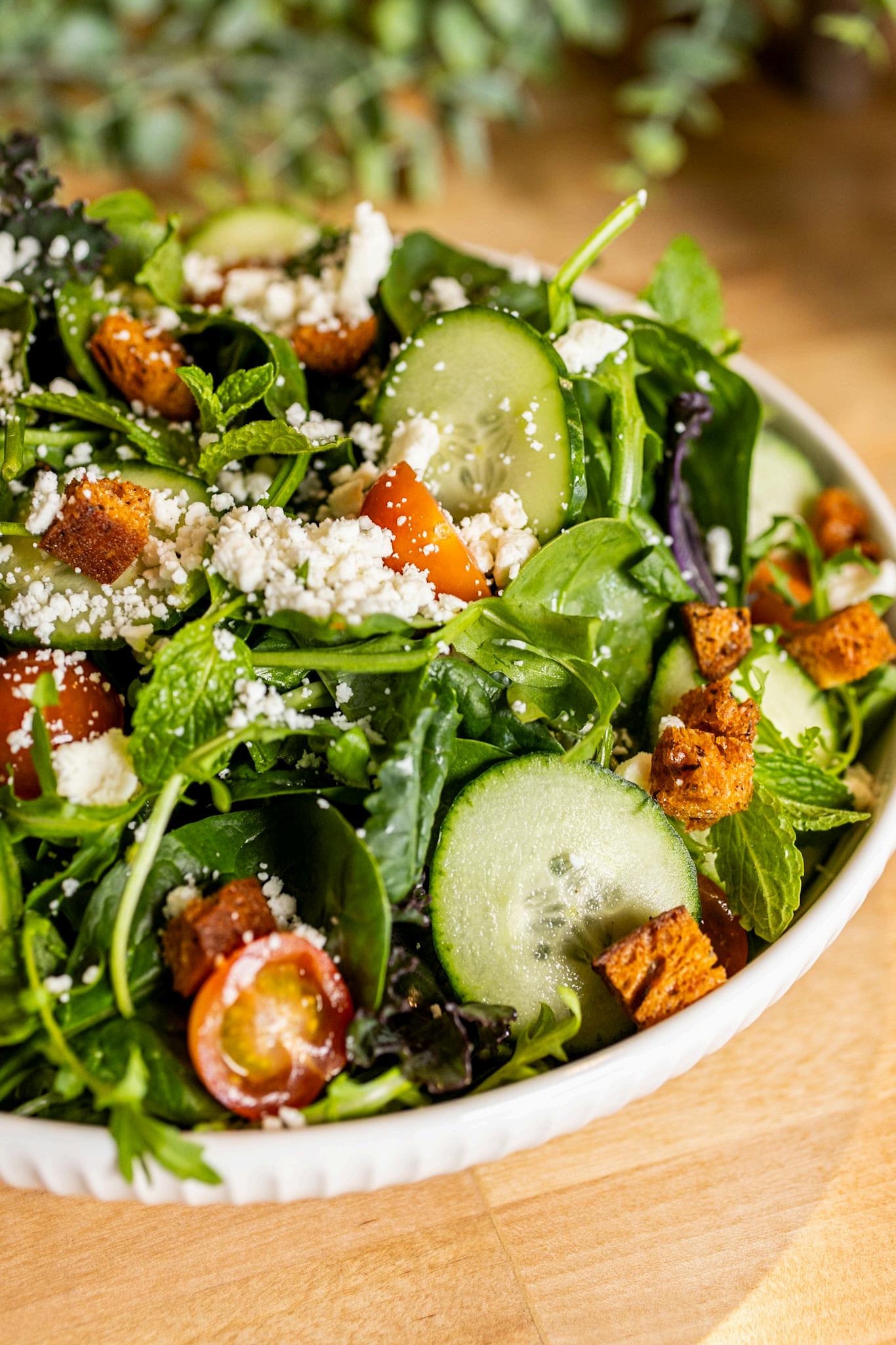 Arugula, mixed greens, tomatoes, cucumber, feta cheese, mint, sourdough croutons, citrus glow dressing