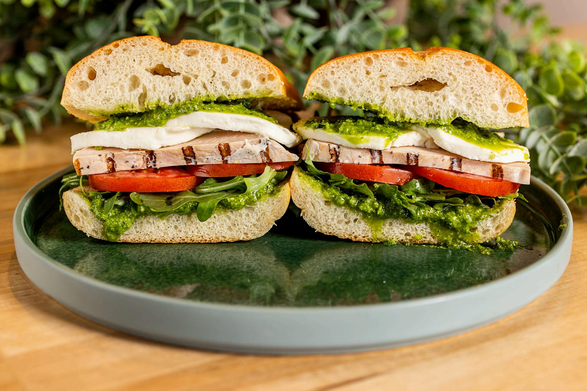 Toasted ciabatta, antibiotic-free chicken, arugula, tomato, mozzarella, kale pesto sauce*, balsamic glaze drizzle