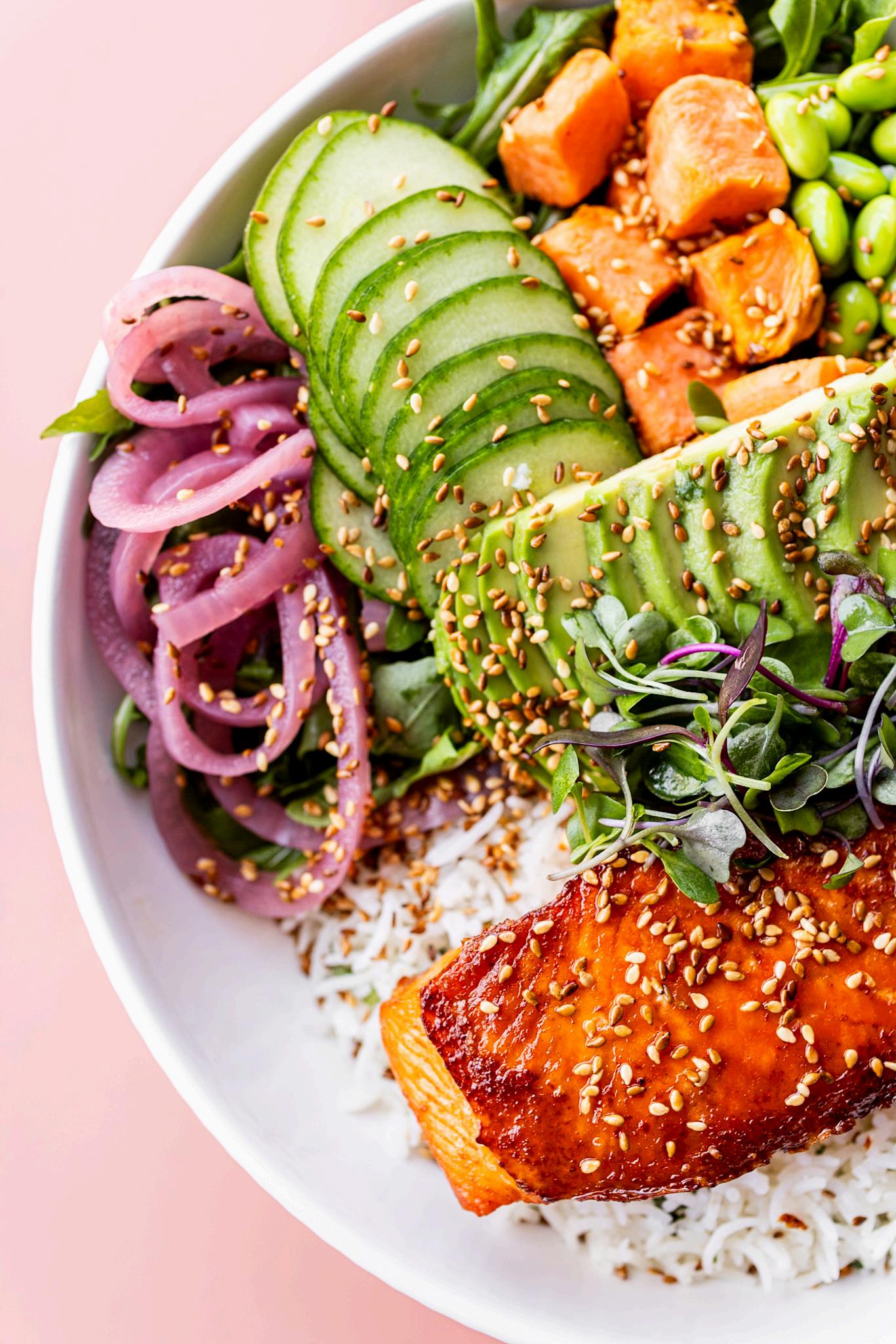 Oven-roasted salmon, jasmine rice, seasonal roasted vegetables, avocado, sesame seeds, house teriyaki glaze, mixed greens