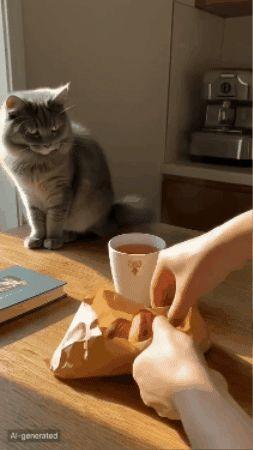 Prompt:scenadiunacucinaaccoglienteconcalde tonalitàmattutine,conungatto,unlibroeuna tazzaditèsultavolo,emanicheestraggonoun croissantfrescodaunabusta