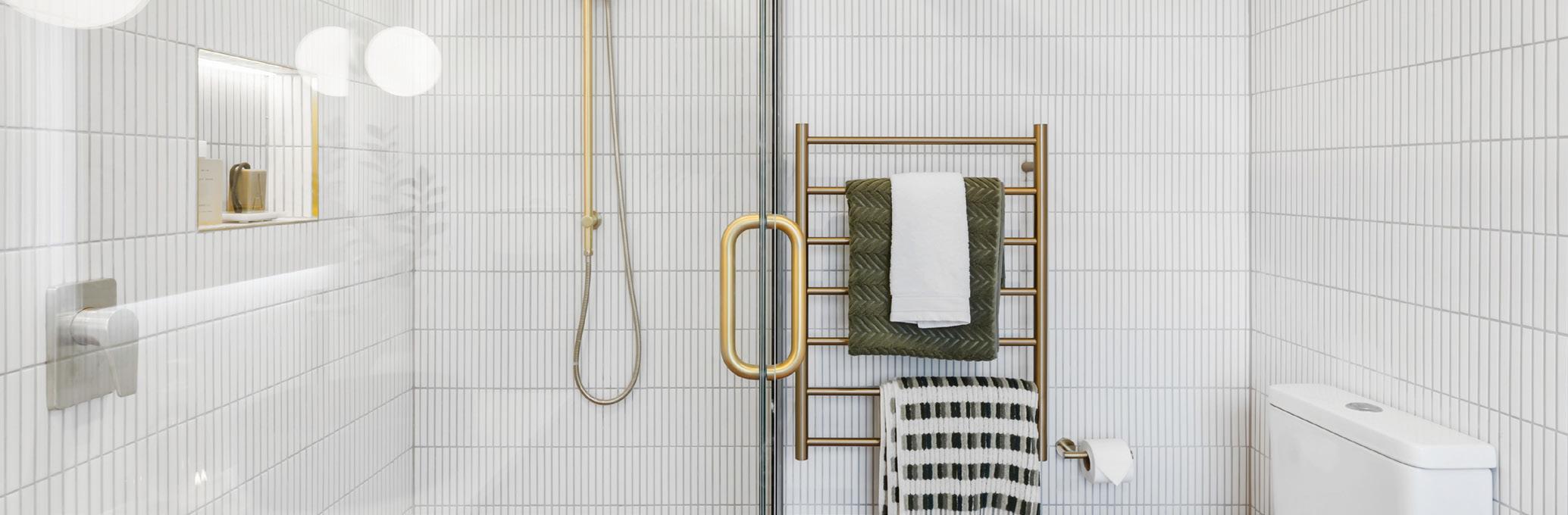 Chloe & Ben used brushed brass finishings in their Master Bedroom Ensuite on The Block NZ Season