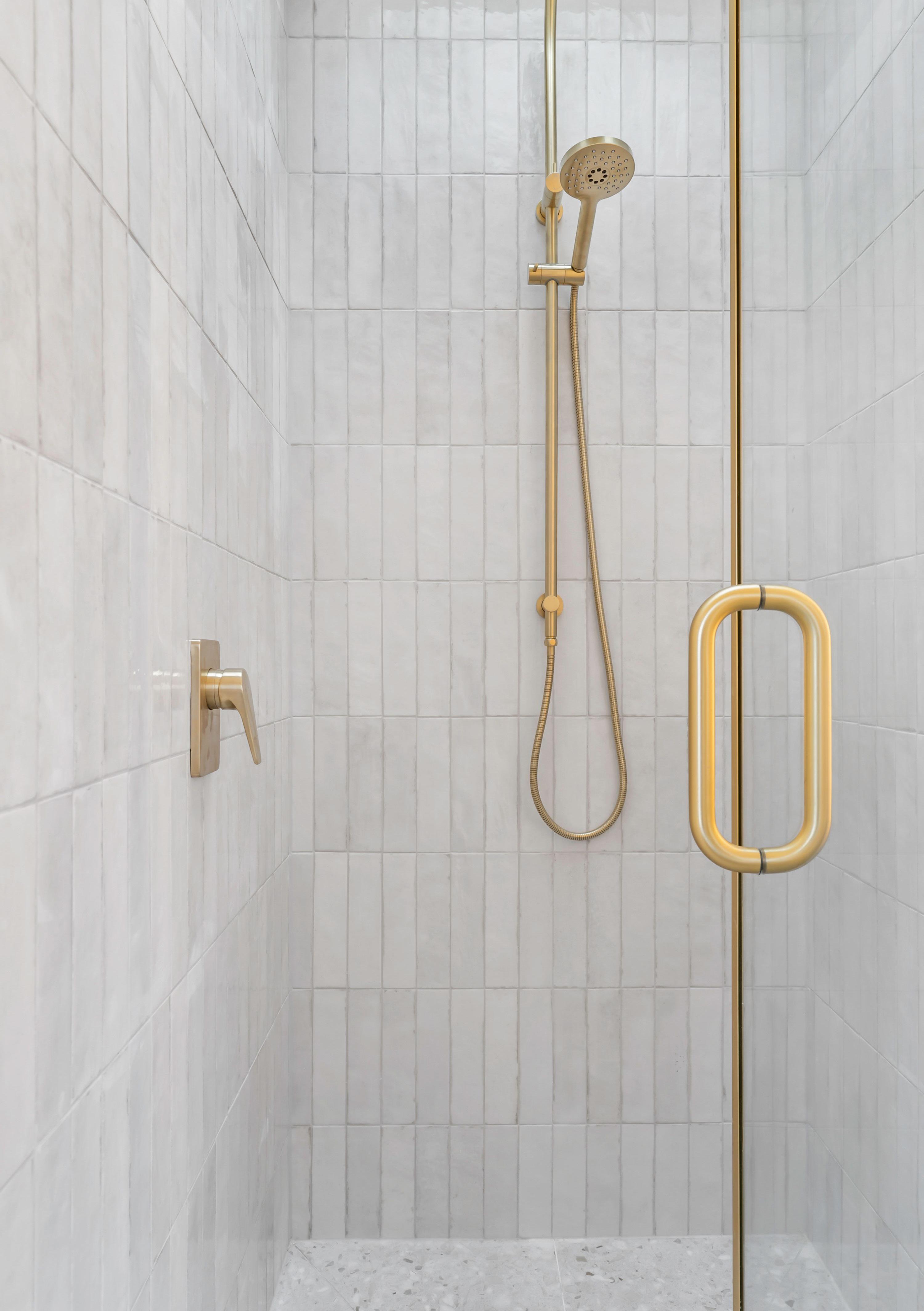 A soft light wall tile can really come to life with complementary brass tapware.
