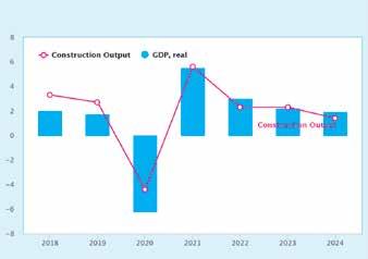 1401/54رــجآیايندهديزگ 73 رد ،تسا رتیفنم یهجوت لباق روط هب دئوس و دنلانف زادنا مشچ .تسا توافتم دصرد 4 ات 3 یلک ینیب شیپ هرود لوط رد کرامناد و ژورن دور یم راظتنا هک یلاح .دنشاب هتشاد شیازفا هب )یزاسون و نارمع یسدنهم ،نامتخاس زاس و تخاس( رازاب یلصا شخب هس ره خرن اب یطسوتم اتبسن دشر دهاش ،یداصتقا نانیمطا مدع یلااب حطس موادت لیلد و نیارکوا رد گنج همادا .دوب دنهاوخ دصرد 3 ات 2 نیب راظتنا دروم هنلااس دشر شیازفا ار هدنیآ دروم رد نانیمطا مدع ،زییاپ رد یریگهمه یلامتحا ددجم یایحا اهروشک یخرب رد زاس و تخاس تعنص رد دوکر هب رجنم تسا نکمم و دهدیم یهجوت لباق شهاک Euroconstruct یلعف یاهینیبشیپ ،ویرانس نیا رد .دوش .دنکیم ینیبشیپ 2024 لاس رد % 1.3 هب ینوکسم زاسوتخاس دشر خرن رد ار ،2020 لاس رد ینوکسم ریغ یاهزاس و تخاس لک دیدش شهاک لابند هب راظتنا ،لاح نیا اب .دبای دوبهب 2022-2024 لاس رد دیلوت هک دوشیم ینیبشیپ ،هسنارف( EC-15 روشک نیدنچ رد ینوکسم ریغ یاهزاس و تخاس هک دوریمن یروهمج و یکاولسا( EC-4 روشک ود رد ای )دنلریا و دنلانف ،ناتسلگنا ،ناملآ .ددرگزاب یریگ همه زا لبق حطس هب )کچ نیا ریثأت تحت ار بیسآ نیرتمک هک یشخب ،نارمع یسدنهم دوشیم ینیبشیپ لیلد هب )تفای شهاک 2020 لاس رد % 0.4 اهنت هدزاب( دید ریگهمه یرامیب یاهلاس نیب % 2.7 هنلااس طسوتم روط هب ،گرزب یتخاسریز یاههژورپ یارجا دشر خرن ،2023 لاس رد یدصرد 3.9 شیازفا زا دعب .دنک دشر 2024 و 2022 × .تفای دهاوخ شهاک 2024 لاس رد % 1.7 هب یهجوت لباق روط هب هنلااس داـــصـتـقا )یعقاو طیارش رد رییغت دصرد( وروی هقطنم رد زاس و تخاس یجورخ لک -1 لودج ینیبشیپ زادنامشچ روشک 2018 2019 2020 2021 2022