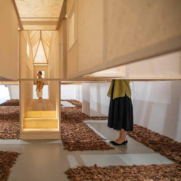 Realizzata quasi interamente in carta artigianale e legno di pino, l’opera riflette sull’interazione tra corpo, sguardo e materia.