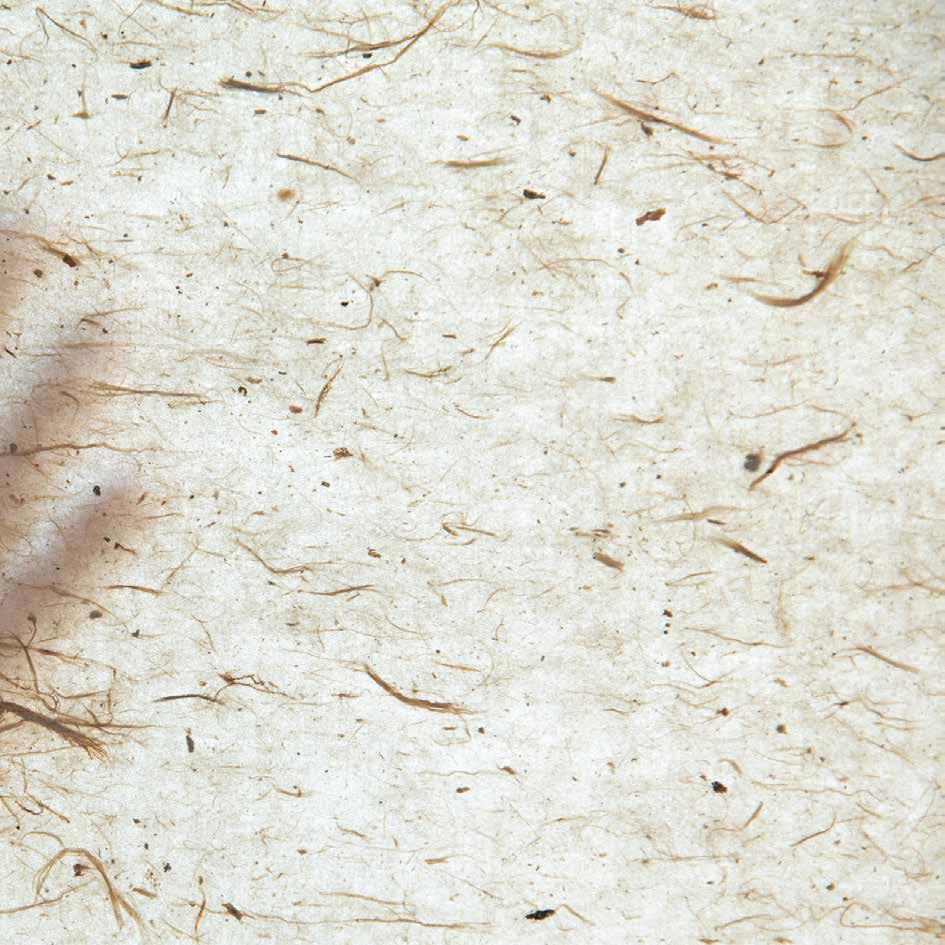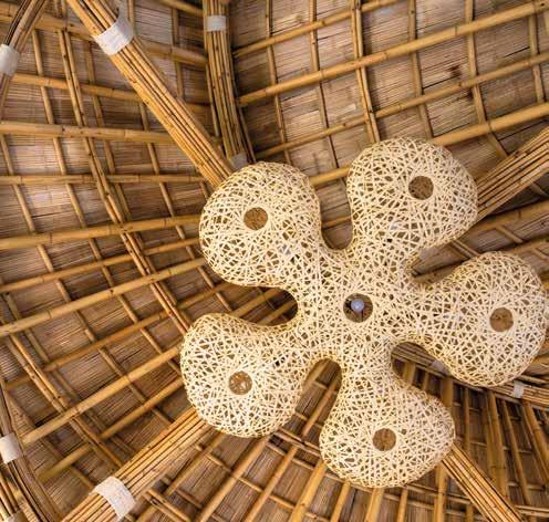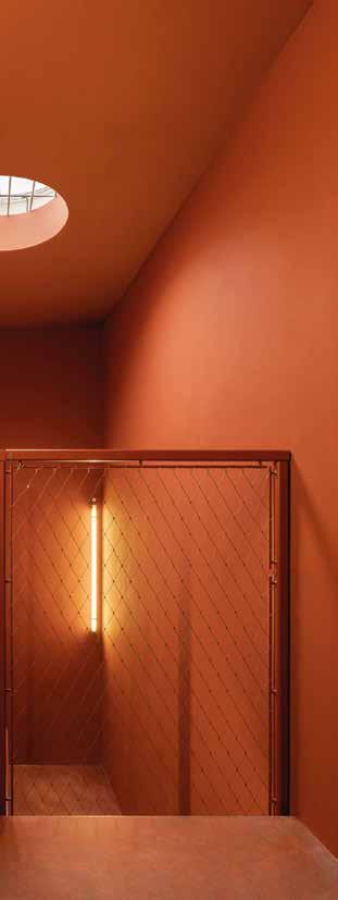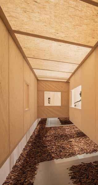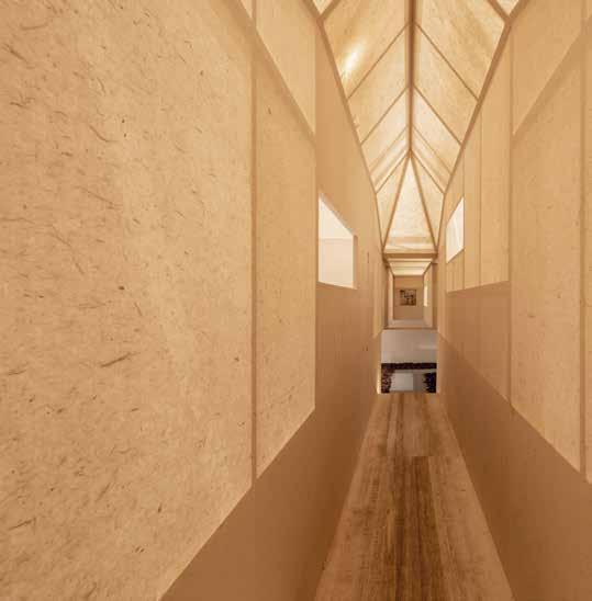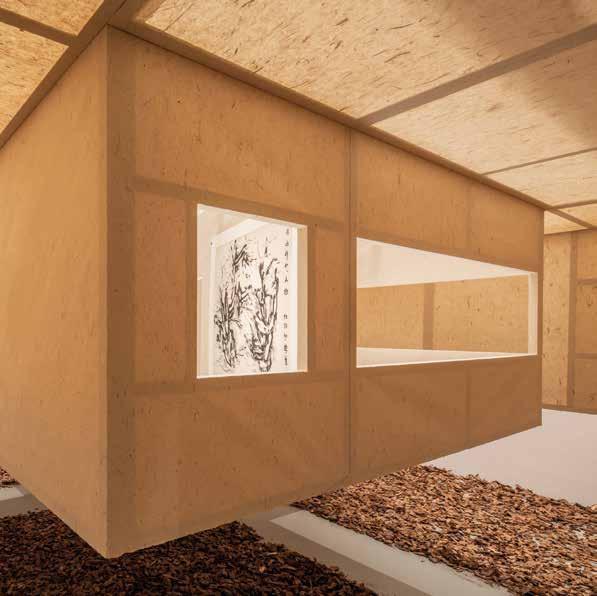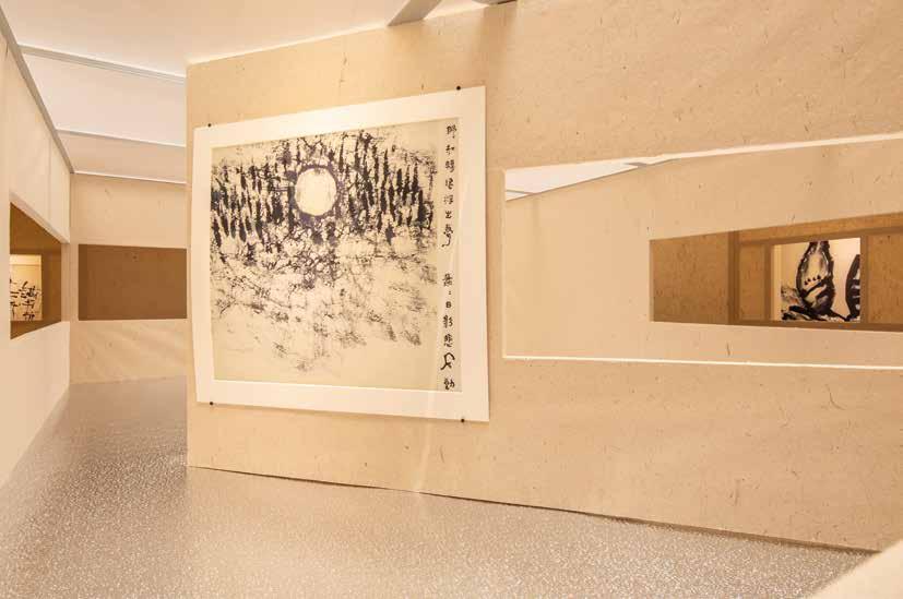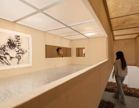 chiostro. Il rivestimento è costituito da carta artigianale effetto cuoio, prodotta a Jingxian, nella provincia cinese di Anhui. Dalle fibre evidenti e dalla consistenza morbida, questo tipo di carta lascia filtrare la luce con delicatezza, regalando un’atmosfera calda e ovattata. È leggera, facilmente sospendibile e sostituibile in base alle esigenze espositive.