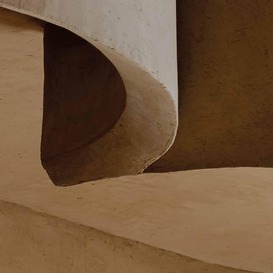 L’organizzazione degli spazi al piano terra ruota attorno ad una accogliente stanza circolare la cui metratura è volutamente lasciata scevra di arredi per permettere alla luce naturale e alla ventilazione di penetrare in profondità in tutti gli ambienti senza impedimenti, seppur arricchita da tappeti in pelli di recupero provenienti da produzioni locali, che aggiungono un tocco primitivo in contrasto con il cemento grezzo delle pareti. Questo peculiare disimpegno circolare, abbracciato dalla sinuosa scala interna in legno, suddivide la zona notte in due camere, orientate rispettivamente a est e a ovest, ognuna dotata di anticamere funzionali con servizi e spazi di stoccaggio. Nella stanza orientata a est, il soffitto a volta in cemento distribuisce il carico della copertura soprastante.