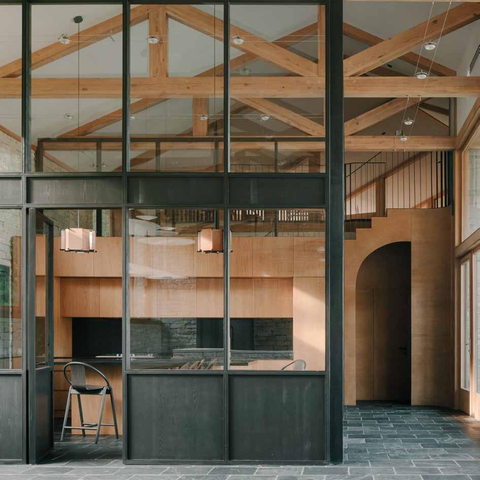 Al di sotto della struttura in legno del tettogiardino si sviluppa un ampio ambiente centrale che accoglie la cucina, la zona pranzo e una veranda d’ingresso, evocando gli spaziosi loft dei fabbricati industriali e le sale delle chiese vittoriane della zona. Un muro interno in cemento, dalla texture particolarmente ricca, conferisce carattere allo spazio e funge da isolante termico, migliorando il comfort ambientale e riducendo il riverbero acustico tra le pareti perimetrali.