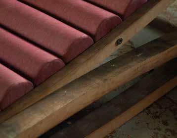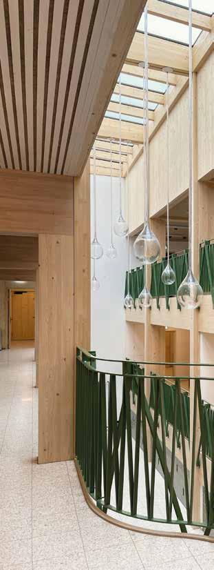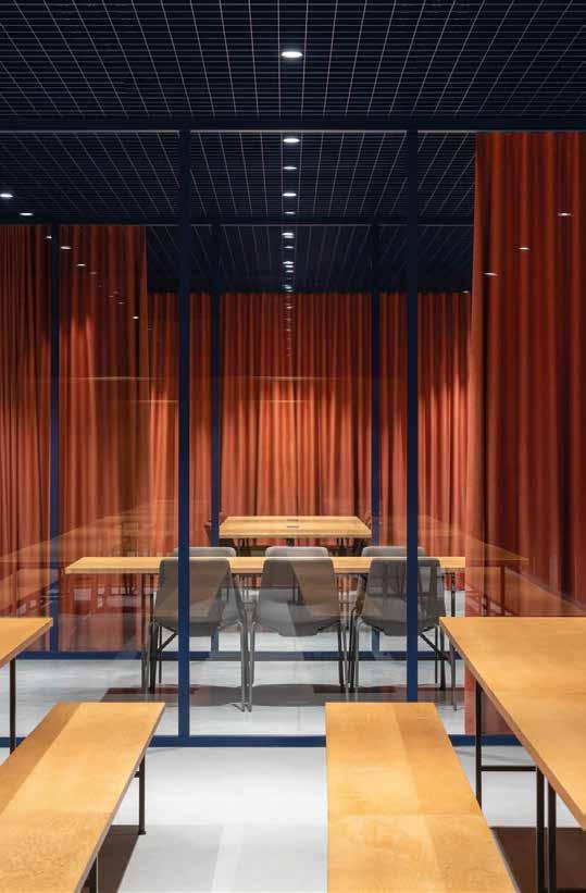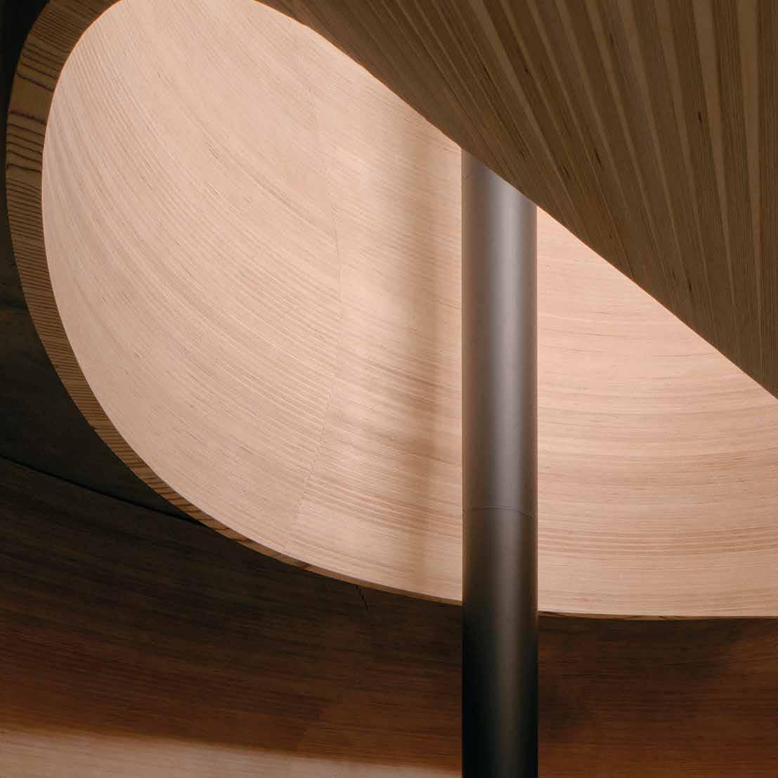 poco invasivo, facilmente prefabbricabile e stabile una volta sospeso. I telai in pino, suddivisi per zone, sono fissati a profili a “T” in alluminio e appesi alle travi superiori tramite sottili cavi d’acciaio.