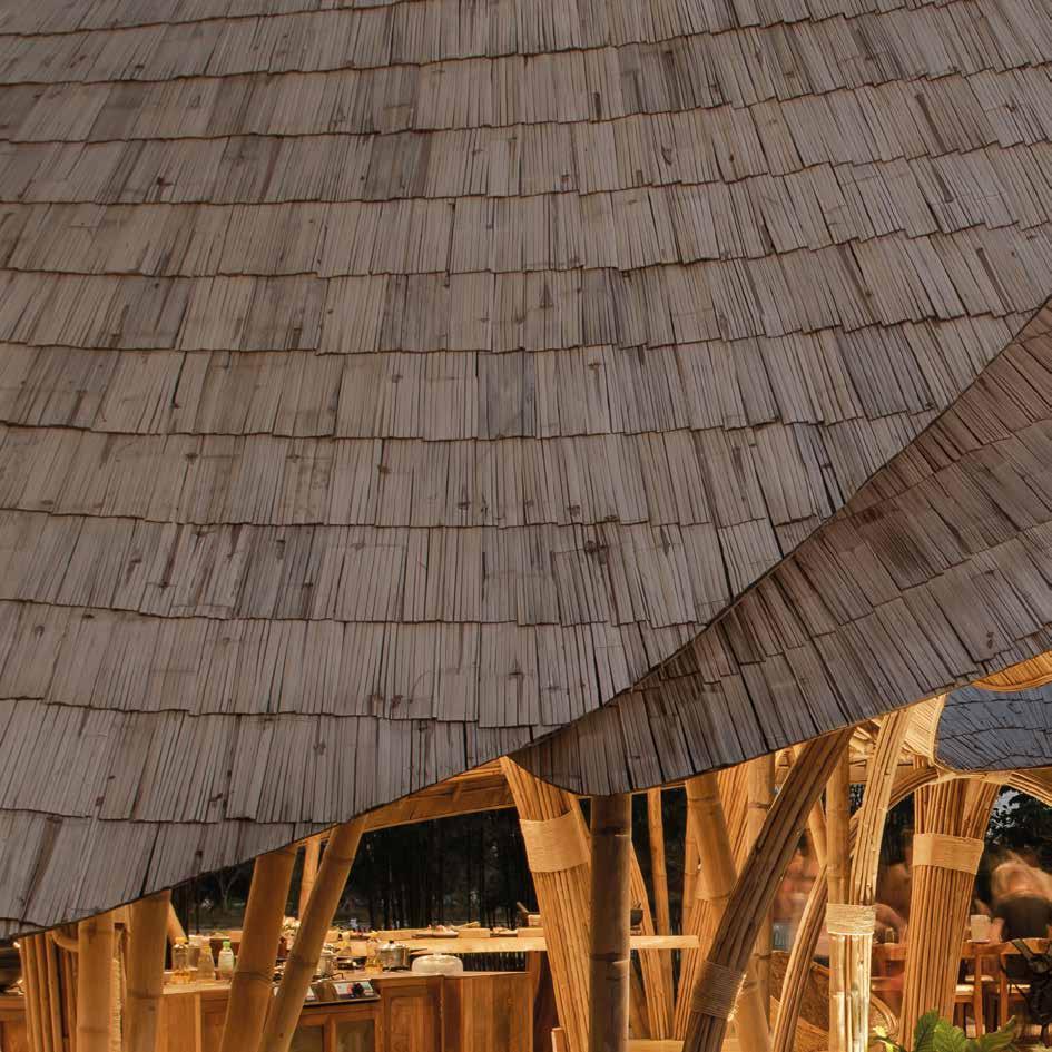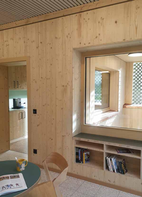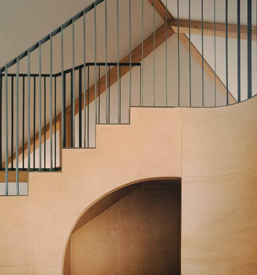 Il legno massello e il compensato impiegati sono certificati FSC, mentre gli elementi in calcestruzzo sono stati realizzati con casseforme riutilizzabili. Il PIR, fresato a CNC per creare la texture del cemento interno, è stato successivamente riutilizzato come isolamento per la copertura.