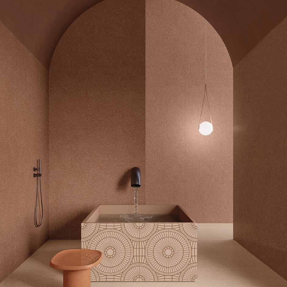 L’azienda combina radici artigianali e tecniche up-to-date per plasmare finiture per superfici dall’alto valore aggiunto: graniglie, smalti, inchiostri e fixer arricchiscono il gres porcellanato con nuove texture, conferendogli profondità e accattivanti sfaccettature, nell’ottica di proporre effetti materici ancor più coinvolgenti e custom, rispondenti alle esigenze della moderna progettazione architettonica e dell’interior design più sperimentale.