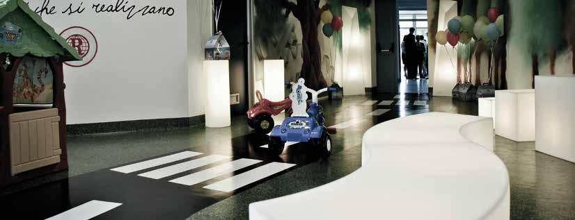 Il “cielo” del “cortile” e dello “stagno” è rappresentato da lastre in polipropilene satinato retroilluminate, che simulano la luce naturale, mentre il “suolo” è reso attraverso fogli di stagnola piegata, che evocano astrattamente la superficie dell’acqua. Il percorso è segnato da corteccia di pino, che suggerisce una traccia naturale, stimolando l’immaginazione dei visitatori all’interno di questo giardino di carta.