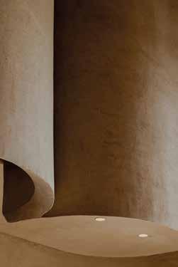 L’atrio illuminato da un lucernario si apre su una maestosa corte centrale che funge da fulcro attorno a cui si avvicendano gli ambienti principali della casa. L’organizzazione verticale degli spazi, con altezze che variano dai 3,6 metri dei patii esterni ai 12 metri del cortile centrale, permette una circolazione fluida dell’aria e crea volumi di transizione tra interno ed esterno. La luce solare indiretta, filtrata attraverso archi e pietre perforate, disegna inoltre suggestivi giochi di ombre che mutano durante il giorno aggiungendo ulteriore profondità alle stanze.