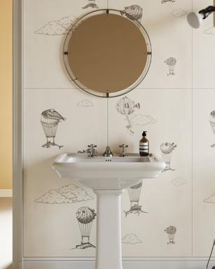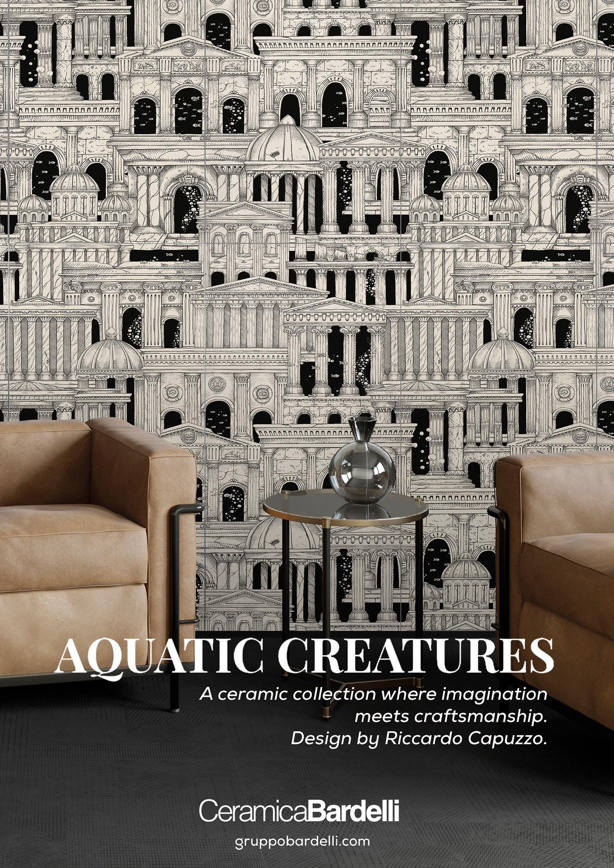 Ceramica Bardelli introduces Aquatic Creatures, a collection created in collaboration with designer Riccardo Capuzzo, known for his creative imagery linked to the marine and underwater world. This new decorative line represents an important technological and communicative milestone: luxury ceramic slabs capable of telling deep stories, going beyond mere aesthetic value. The decorations, inspired by early 20th-century Milanese motifs, celebrate the charm of the sea through a fantastical and eccentric lens, populated by aquatic creatures and dreamlike visions. The collection is available in the 60x120 cm format, on a Colorama base, with cold-printed embossed decorations that offer an engaging tactile experience. Four design lines are featured: Atlantis City, Mongolfiere, Seaweed, and Sea Majolica.