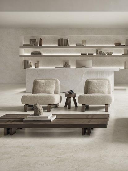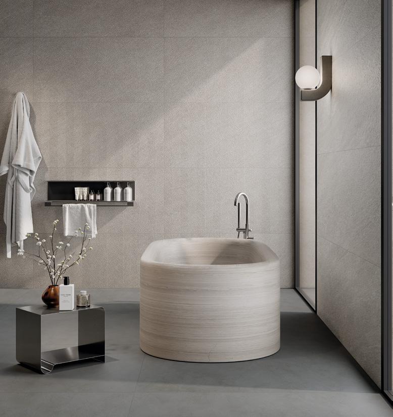 The collection was created from the desire to reinterpret stone in a contemporary way, translating its essence into porcelain stoneware.