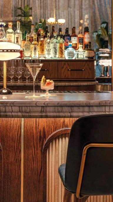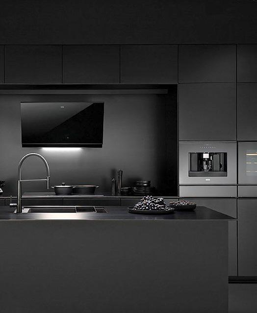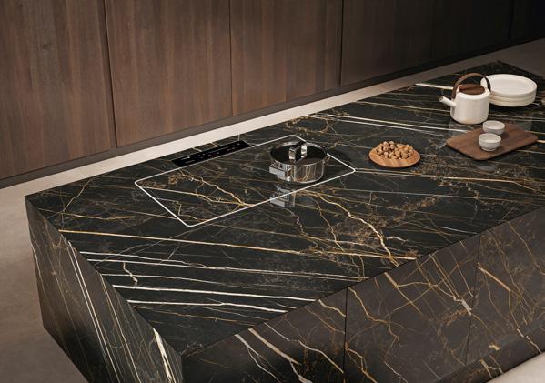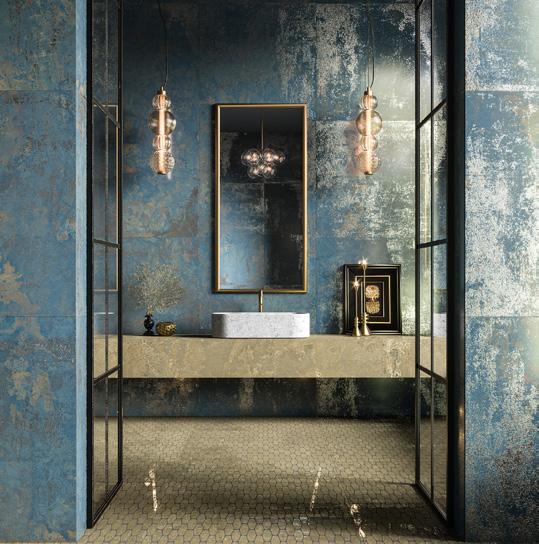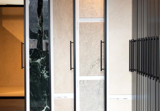 The colour scheme was based on the intensity of UniPepper absolute black, the smoky shades of Majestic Onyx –both by Fiandre – and the golden vein patterns of Onice Grigio by Ariostea.