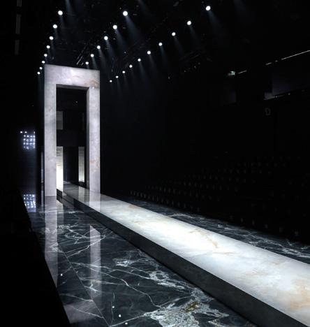 The set design, under the technical curation of Granitech – a business unit of Iris Ceramica Group – saw the application of 300x150cm ceramic slabs on the runway, perimeter walls, backdrop and imposing central portal. The use of large-format panels generated an effect of visual continuity that underscored the monumental character of the set.