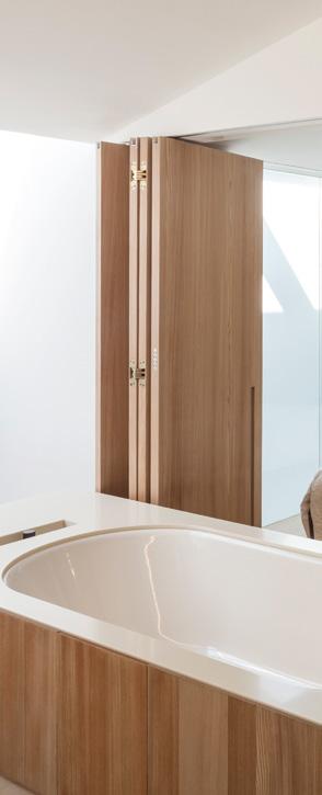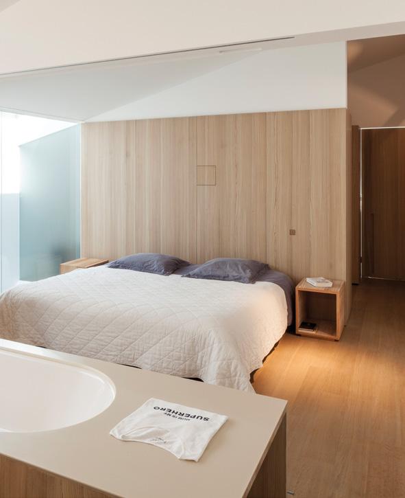 Close attention to the juxtaposition of materials is also discernible in the sleeping area and bathroom facilities. The master bedroom has an en-suite bathroom –separated by a hinged partition – in which the warmth of oak blends with the softness of acrylic stone.