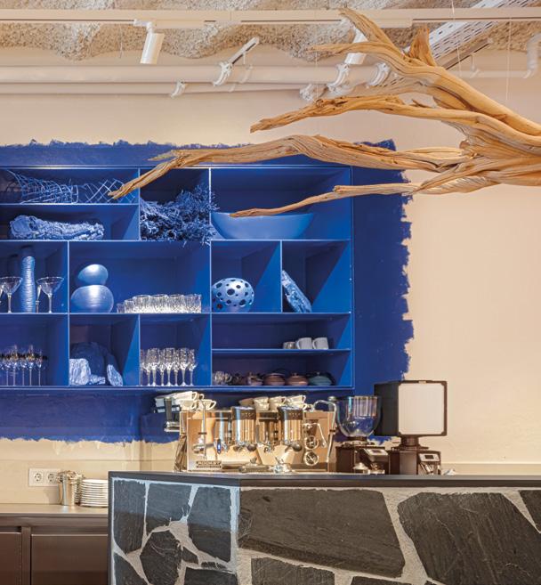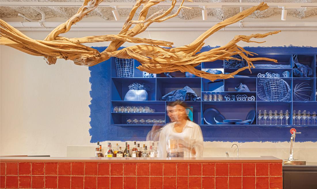 The stand-out feature of the restaurant is the authentic, light-touch atmosphere that emanates from the materials and their hints of the Mediterranean, which finds expression in warm, white, textured surfaces and hand-crafted pieces. A range of natural materials conceptually connect Compartir Barcelona with the architectural landscape of Cadaqués. The grey colour of the slate and its application in “trencadís” – an ornamental technique widely used in Catalan modernist architecture – together with the natural colour of the terracotta tiles and its contrast with the vivid blue of the “windows”, creates an intense, evocative backdrop that almost feels like a scene from a painting.