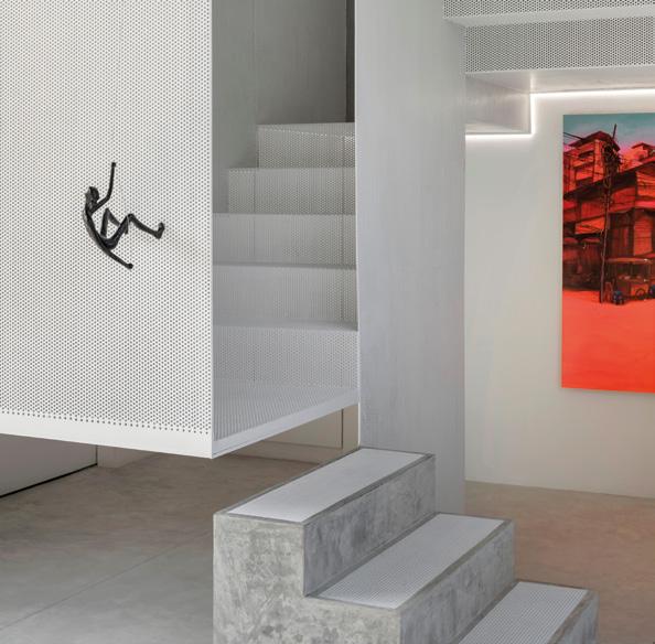 semi-transparent, with each thin sheet of steel geometrically folded to reinforce its strength. The staircase thus becomes self-structured, without the need for any additional support. All of the perforated steel sheets are suspended from the second floor, floating above the first 3 concrete steps, each designed in different forms and materials as if transforming from the ground up. The treads of the 3 concrete steps are covered with perforated steel to prevent slipping.