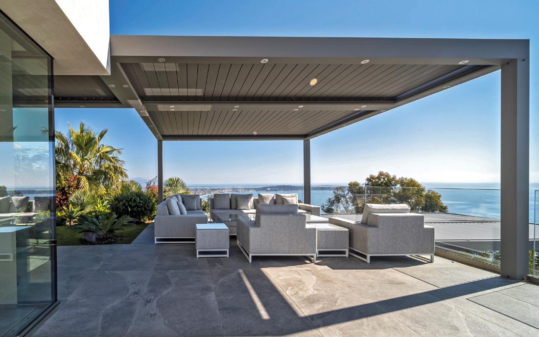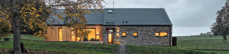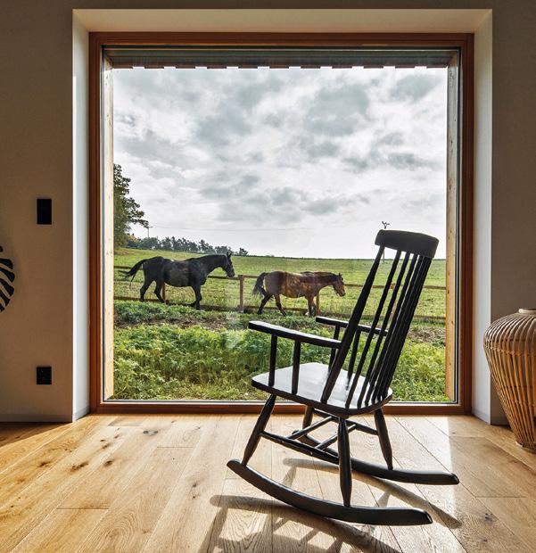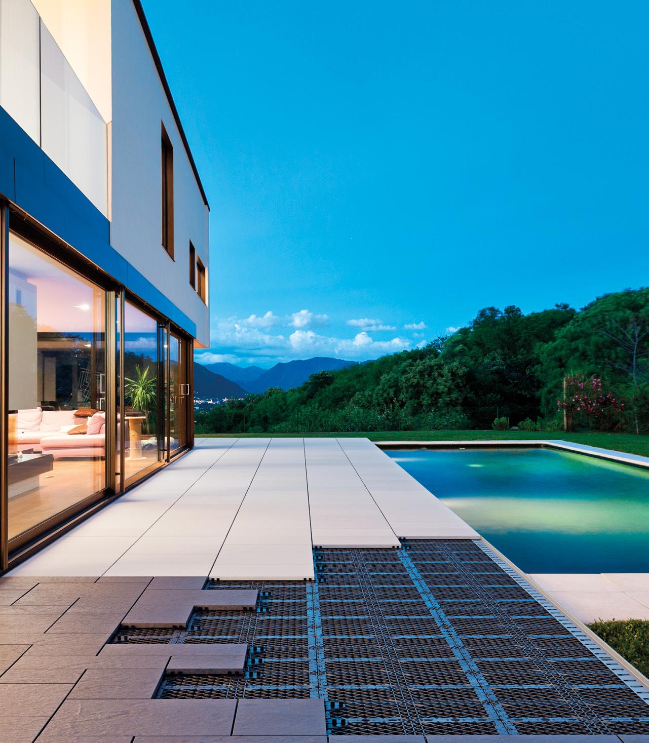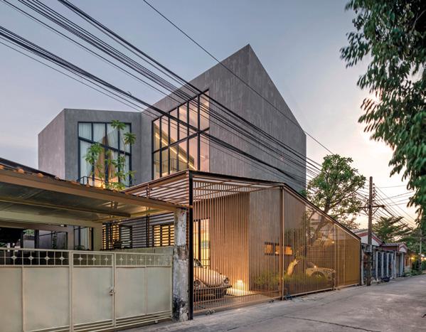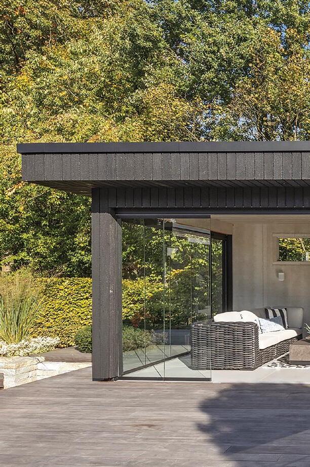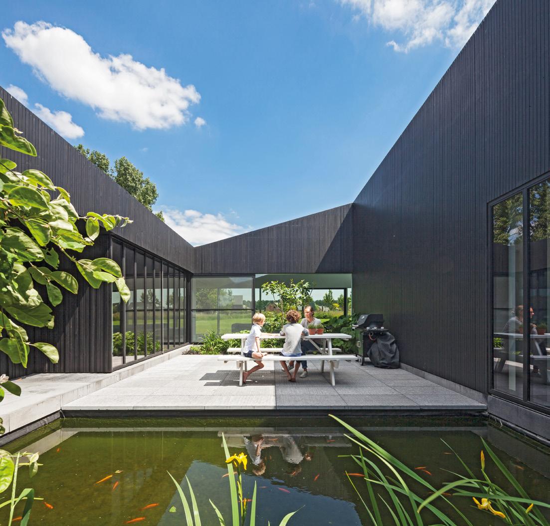 you view the house, transform the façade from grey to bronze and back again. The design of the inner façade, surrounding the patio, takes a different approach. Here, the wood panels are all the same width and thickness, so as to create a more intimate atmosphere. The large windows not only reduce the visual weight of the architecture, they also allow natural light to flood into the interior, while forging links between the greenery surrounding the house and the inner garden.
