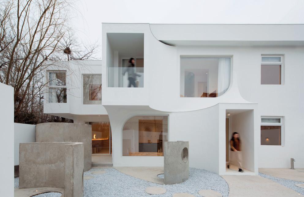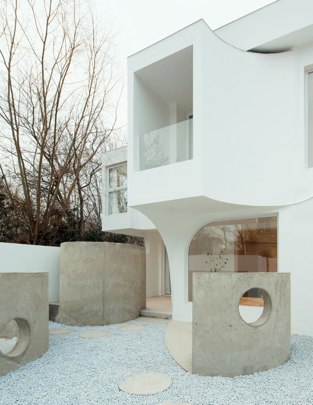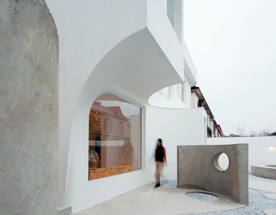 the building by means of geometric composition. The outward extension of the building block, on the facade, is close to nature in a flowing posture, bringing the distance between architecture, nature, and people closer together. The white facade makes the building abstract and sculptural. Through the rendering of white material, the boundary between the wall and the top is blurred. The flowing space and natural light blend together to bring people a pure experience in an imaginative space.