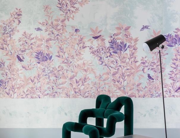 Paradiso, in particular, evokes a dreamlike atmosphere, combined with the ancient taste for bringing luxuriant natural motifs into the intimacy of a home’s sleeping quarters. Drawing inspiration from the frescoes of the Casa del Frutteto, where “garden painting” adorned the architecture of the bedrooms, the designer conceived an ornamental pattern in which nature branches out around the walls. In the foreground, the wallpaper depicts birds in flight and citrus and pomegranate trees, through which we glimpse distant ruins from long-lost times, in a continuous dialogue between the interior and exterior world.