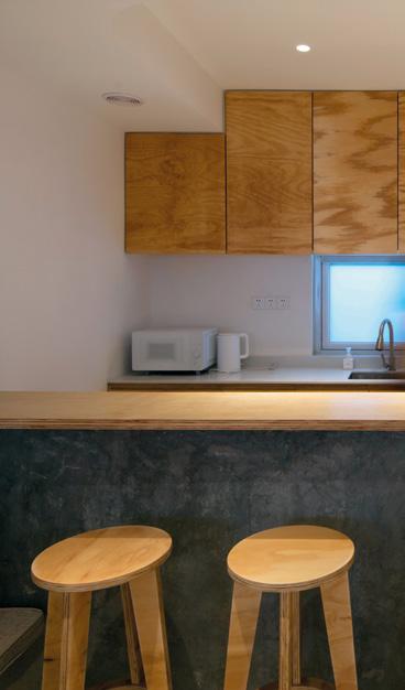 The second floor serves as the owner’s compound, designed for a young man who loves entertaining his childhood friends. The private space was thus designed to facilitate socializing (with food and beverage service), including the tradition of watching football on holidays without disturbing the mother. A living room is set adjacent to the bar, with a small balcony to extending it into a larger space for entertaining. A full guest bathroom with shower is concealed behind the bar, helping to maintain the privacy of the area when a
