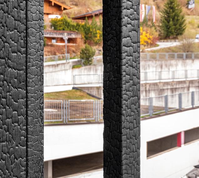 Interest in larch has seen a resurgence in recent years, because larch is a mixed species of tree. Left in its natural, unprotected state, it is often used as a façade cladding, because of the suitability of its properties. However, it has a natural tendency to turn grey and this process starts within a short time. Carbonisation can counteract this effect without compromising the natural look of the wood. Brushing the layer of burnt wood at a later stage can also give it an antique appearance.