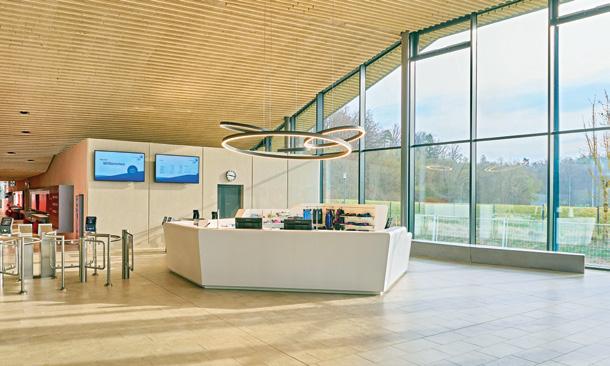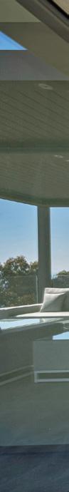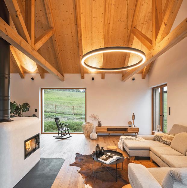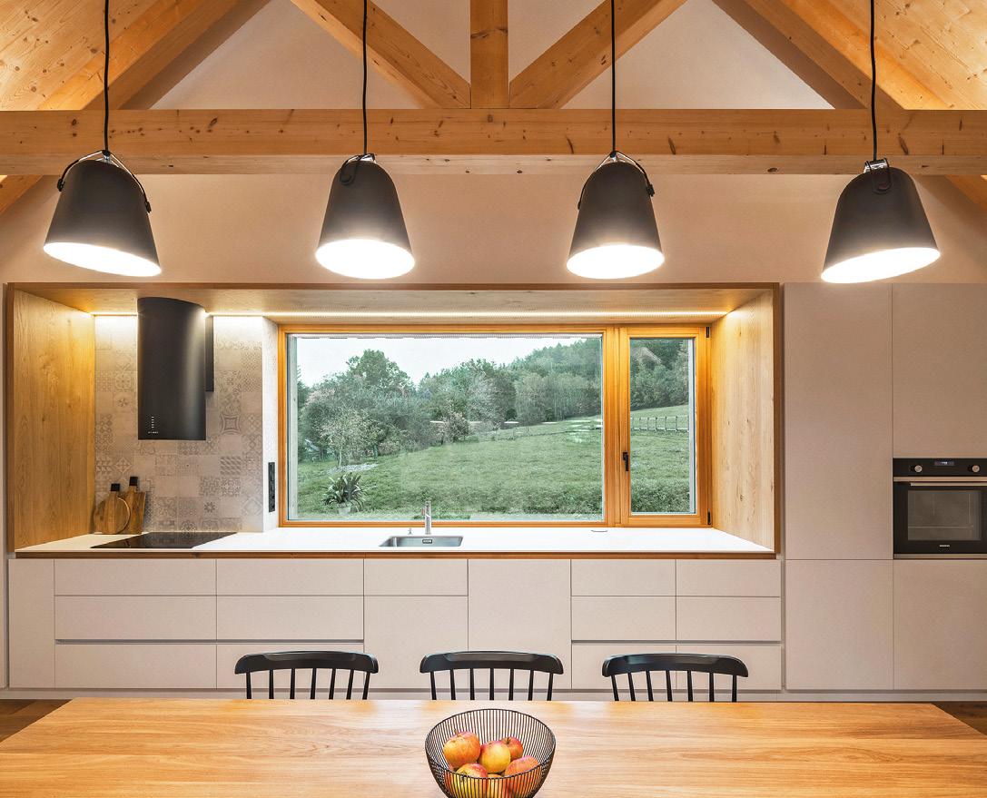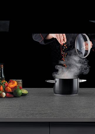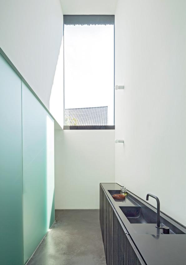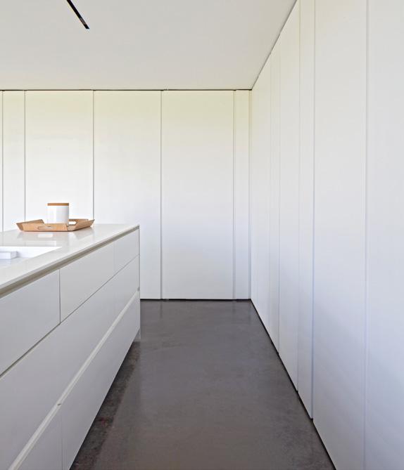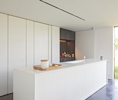 The painstaking design of the interior is not just about aesthetics, it also embraces practicality and high-quality materials. The kitchen fits discreetly into the space it shares with the living area. The two environments are visually separated by a fulllength island between them. The worktop is made of HIMACS Solid Surface, which provides a hygienic, impact-resistant, scratch-resistant continuous surface, with a large sink built into it. The choice of classic, brilliant Alpine White S028 strikes a gratifying contrast with the dark grey concrete flooring.