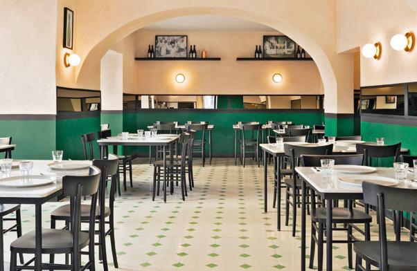 the temple of Neapolitan pizza-making tradition. Reworked with a contemporary slant, the broad green bands on the walls, combined with the square, twotone Aganippe graniglia tiles are a clear stylistic allusion to the historic site.