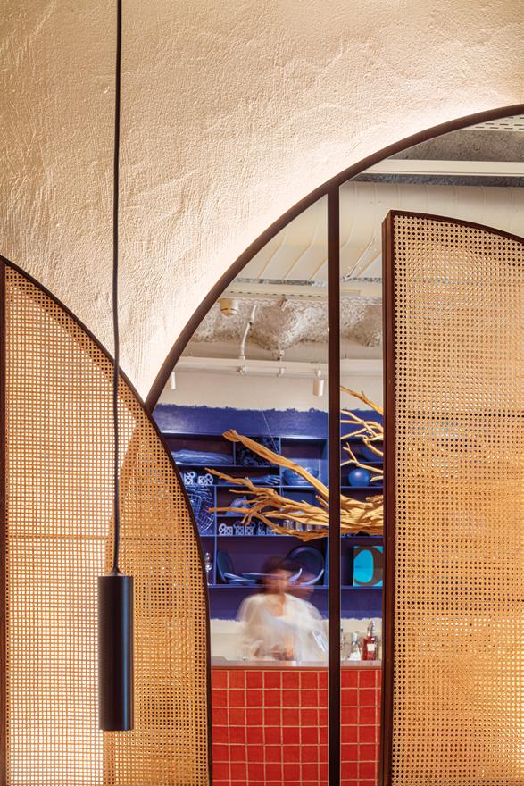 of a different artist, who helped create a series of bespoke pieces, specially designed for the restaurant. The rounded shapes of the mirrors and wicker partitions, combined with the lamps that sprinkle baths of