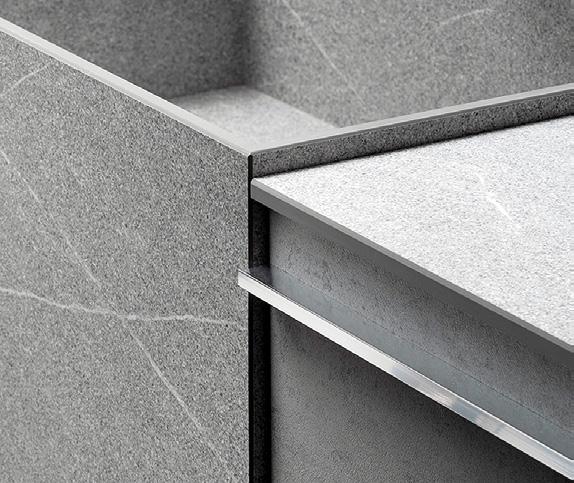 corretta impermeabilizzazione e riduce la migrazione di resine in superficie. Il secondo elemento, PROTERRACE DOUBLE DRIP, è dotato di una parete verticale che protegge la parte terminale delle piastrelle, e di una seconda parte che preserva il perimetro degli spazi esterni. Il profilo è dotato di un distanziatore che ne garantisce il corretto posizionamento, mentre la striscia adesiva impedisce al silicone di ostruire i fori di drenaggio.