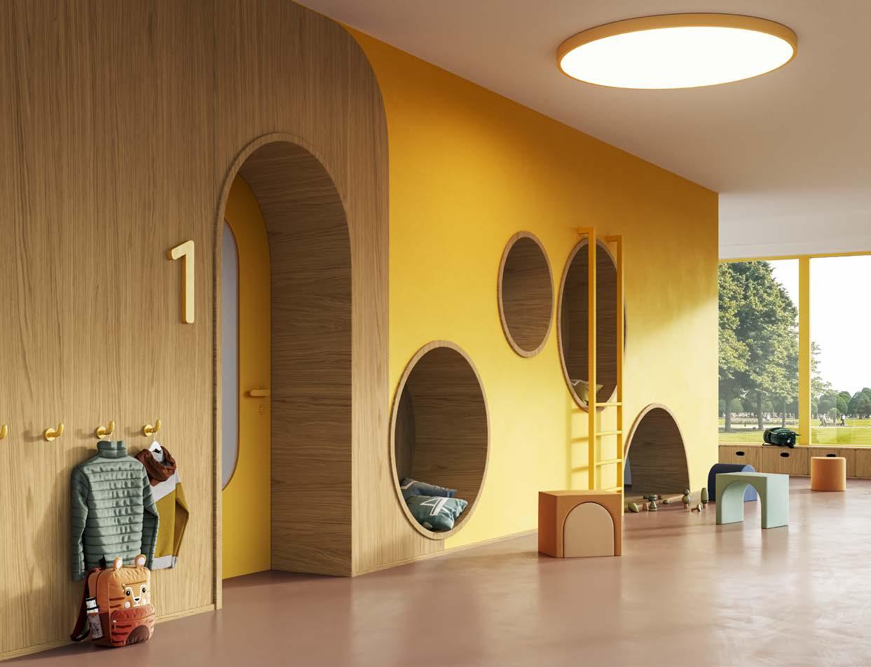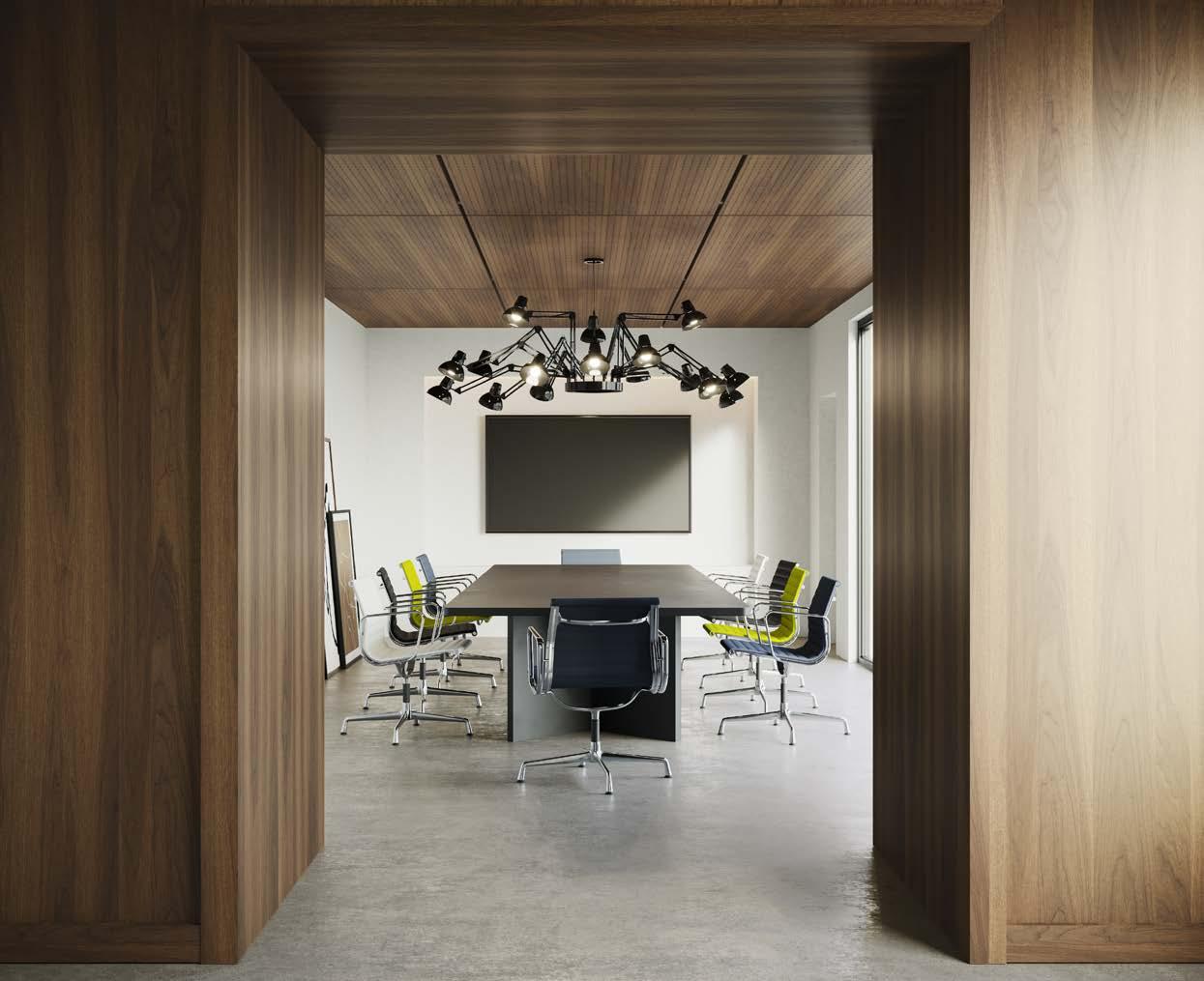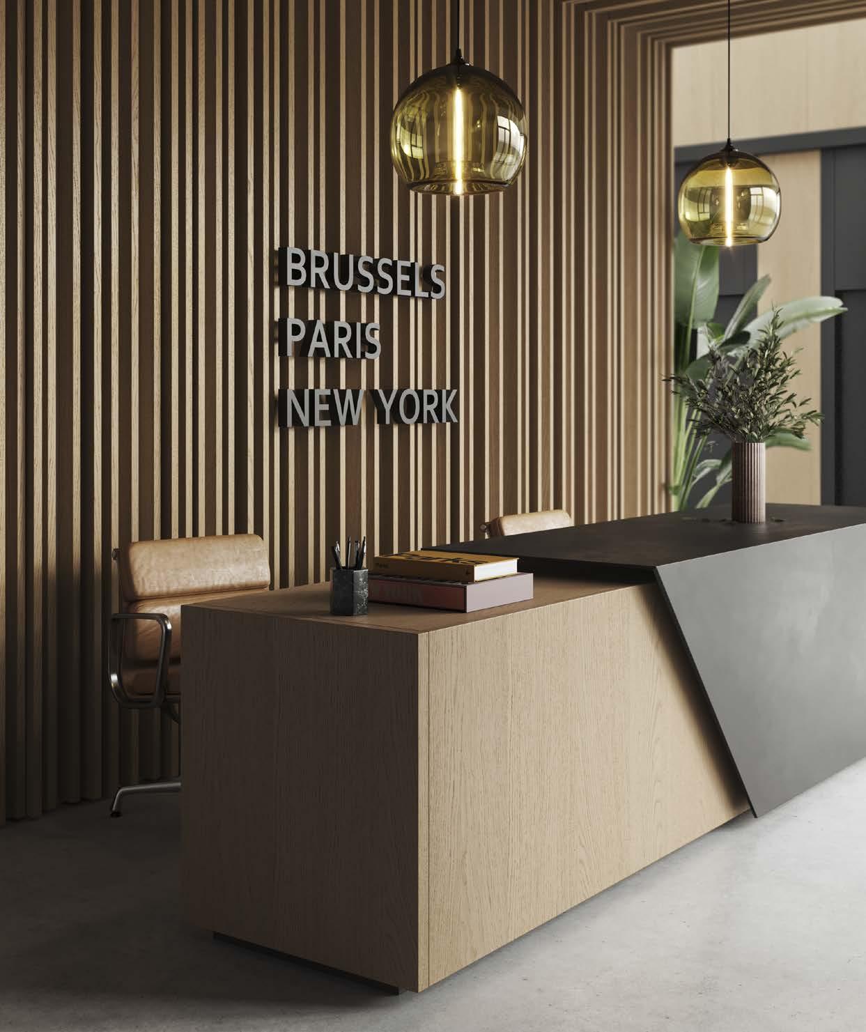 Astrata slats are veneered beams with MDF core for wall and ceiling applications. The smallest beam is finished on 3 sides, making it ideal for flush mounting against a surface. The other formats are finished on 4 sides and be used to build striking room dividers.