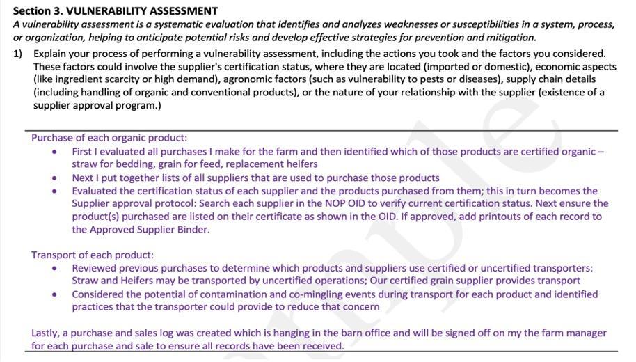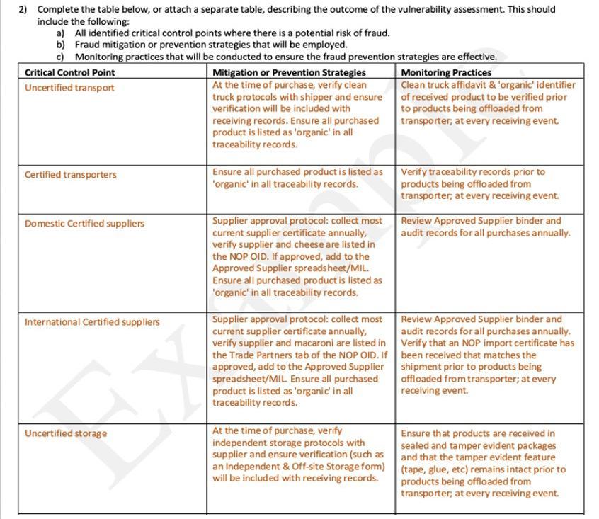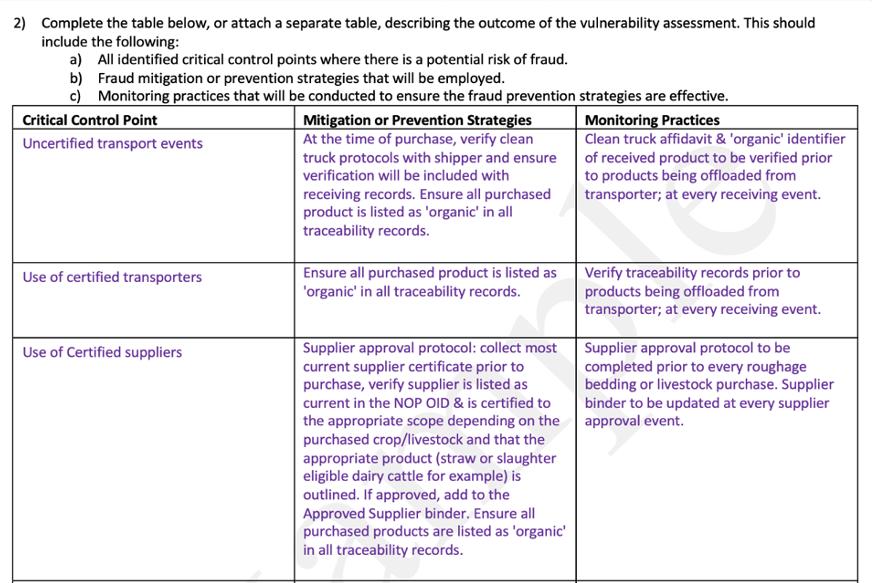 This assessment is a critical step in an organic fraud prevention plan The OFPP asks operations to include a description of the steps taken when evaluating risk through the vulnerability assessment, the factors that were considered when identifying the CCPs and determining the prevention and mitigation strategies that are employed Below are examples of possible factors that may be considered when evaluating risk of a supply chain: