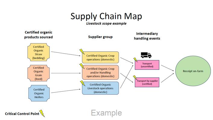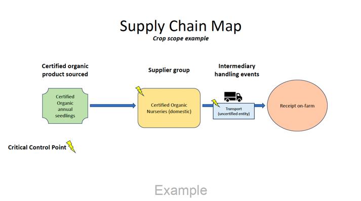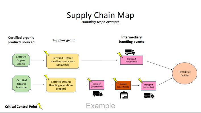 Critical Control Points (CCPs) are specific stages in a process where control measures are applied to prevent, eliminate, or reduce risk to an acceptable level, ensuring the integrity and quality of a product Operations must evaluate their supply chain and identify areas where there is potential for fraud to occur and for a product/ingredient to lose its organic status. The supply chain map must include identification of critical control points. In the supply chain map examples above, CCPs are identified with lightning bolts.