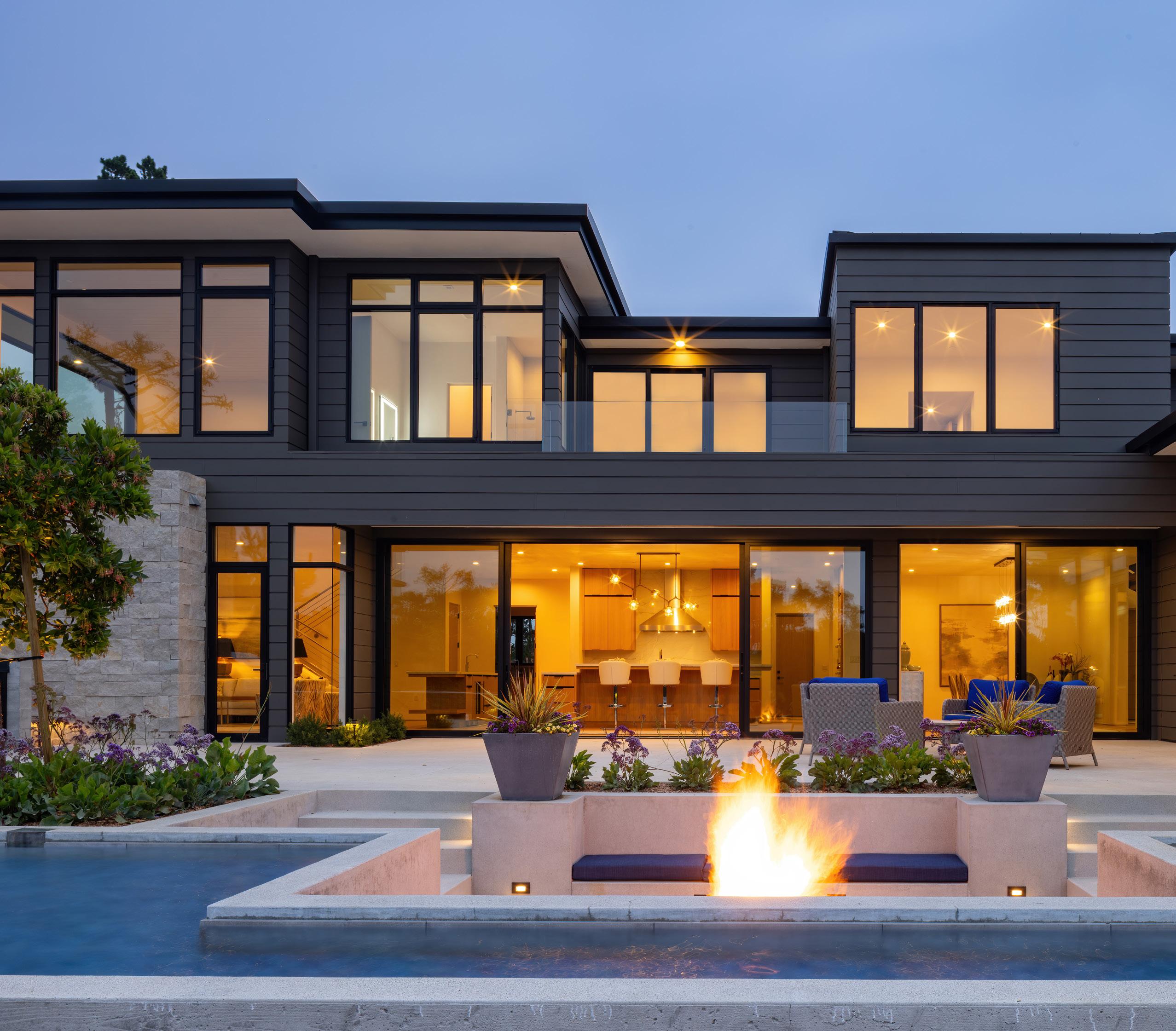 • Dramatic pool/water feature wrapping around sunken fire pit